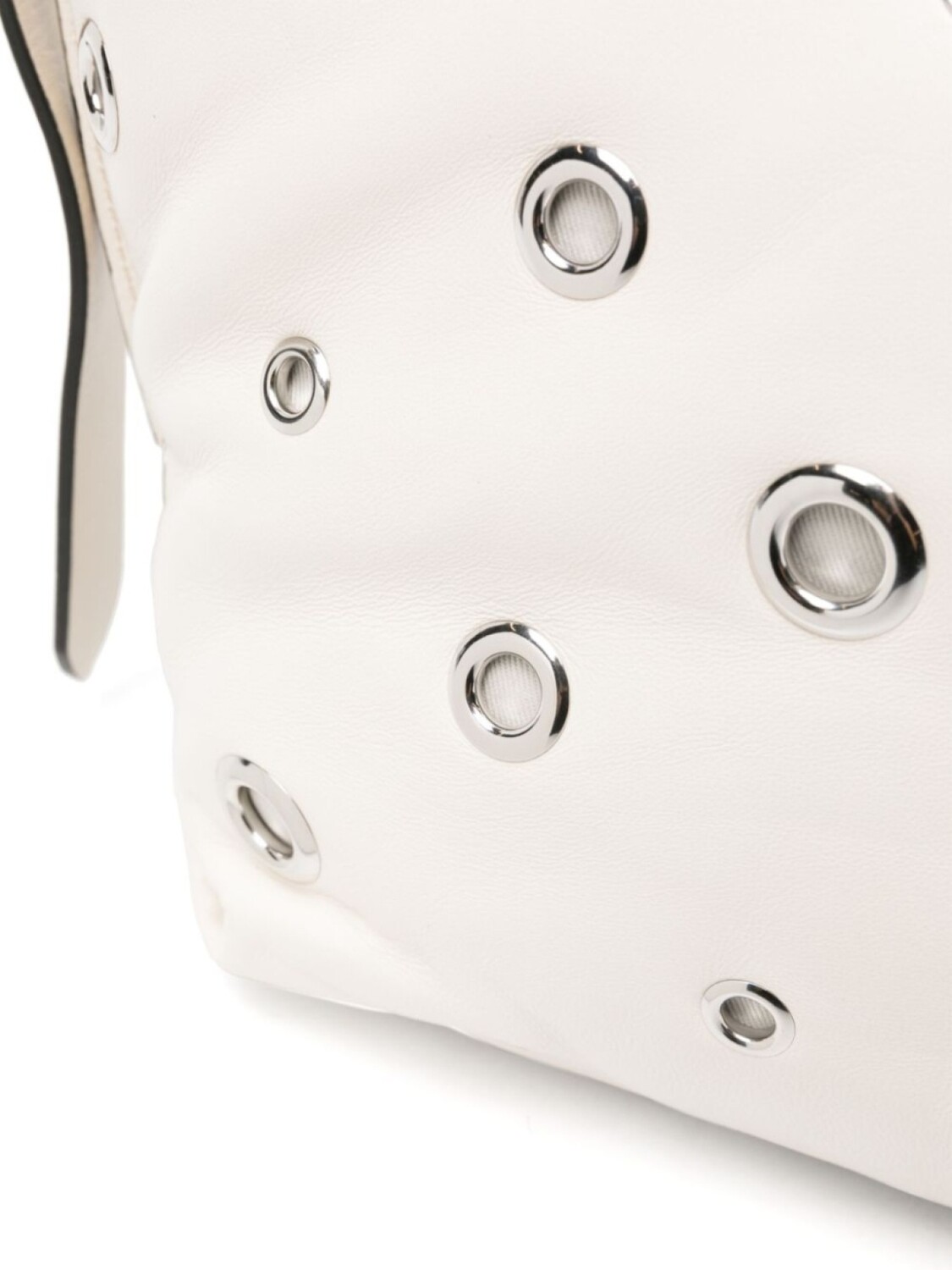 Серовато-белый, овечья кожа, зернистая текстура, тисненый логотип спереди, отделка металлическими люверсами, застежка на молнии сверху, съемный регулируемый ремень на плечо, несколько отделений, тисненый логотип внутри, внутренний накладной карман, внутренний карман на молнии, подкладка из хлопка, серебристая фурнитура