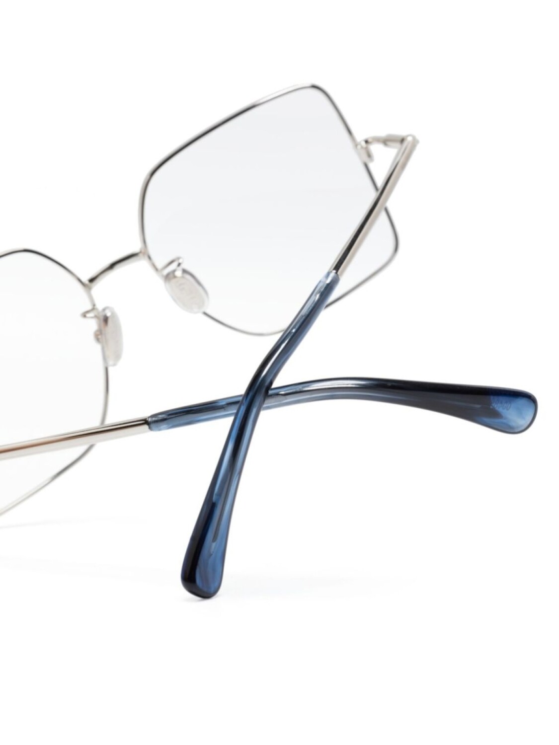 Серебристый, расцветка Ocean Blue, металл, прозрачные линзы, квадратная оправа, оправа оверсайз, носоупоры, прямые дужки и дужки с закругленными концами. Обратите внимание, что на FARFETCH продаются оправы с линзами без диоптрий. В комплект входит защитный чехол для очков.