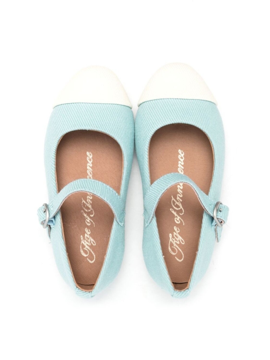 Голубой, белый, ткань в мелкий рубчик, контрастный носок, миндалевидный носок, застежка с пряжкой спереди и плоская подошва.