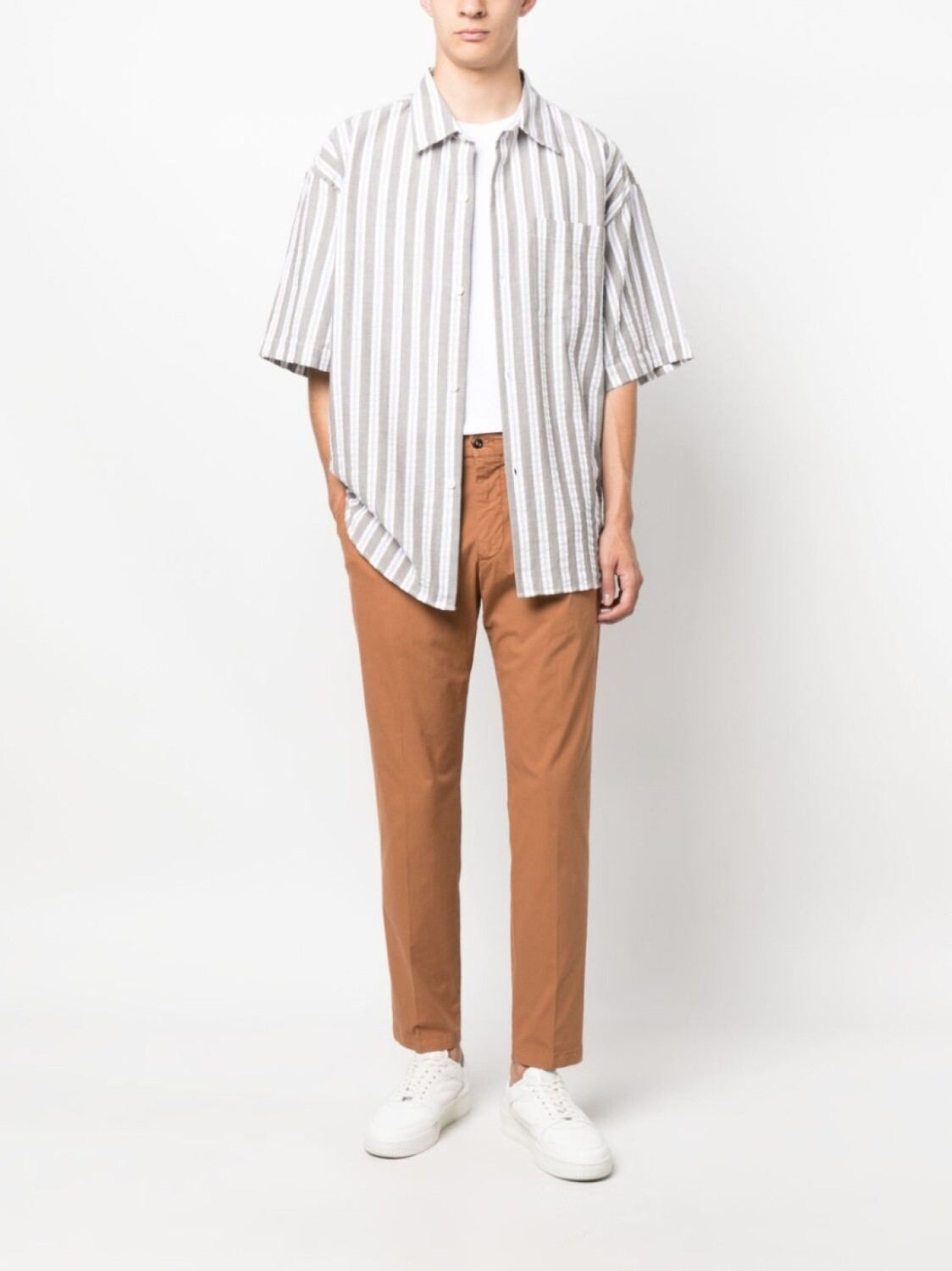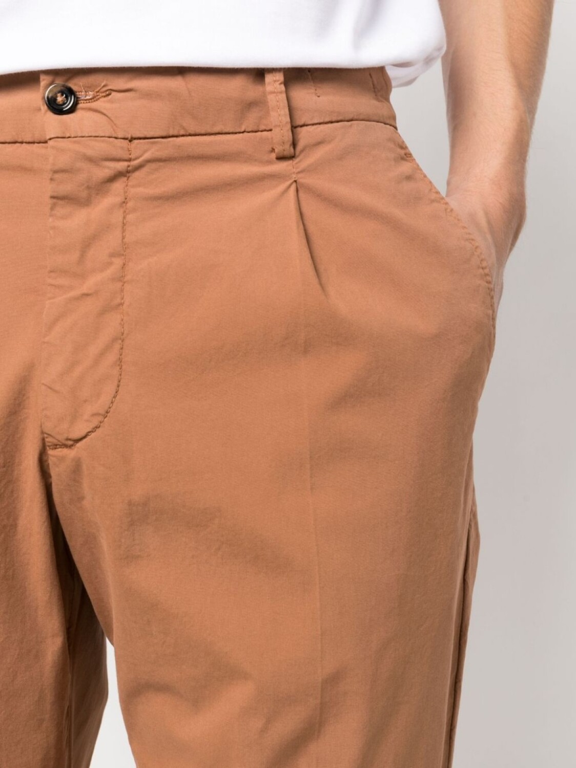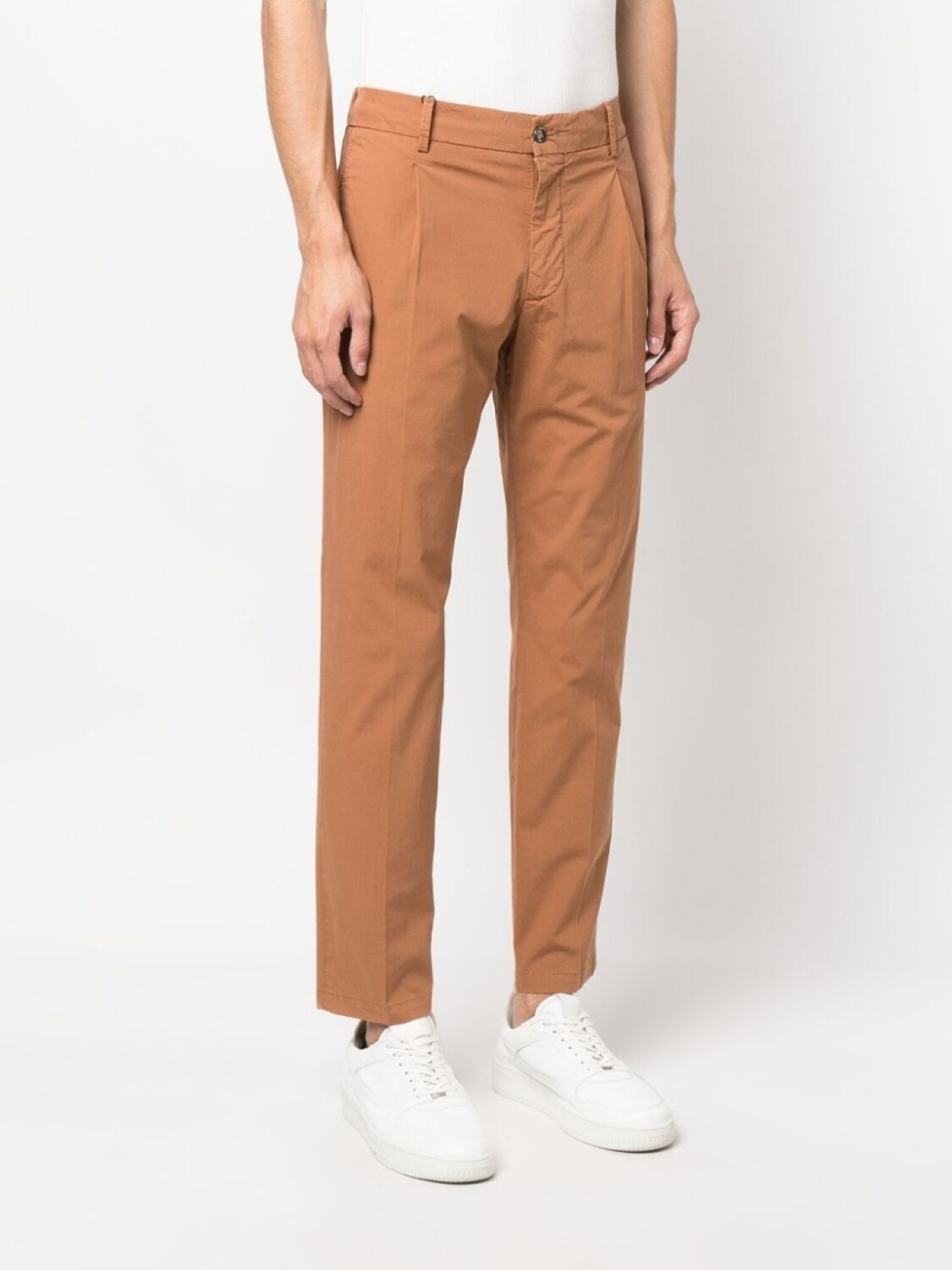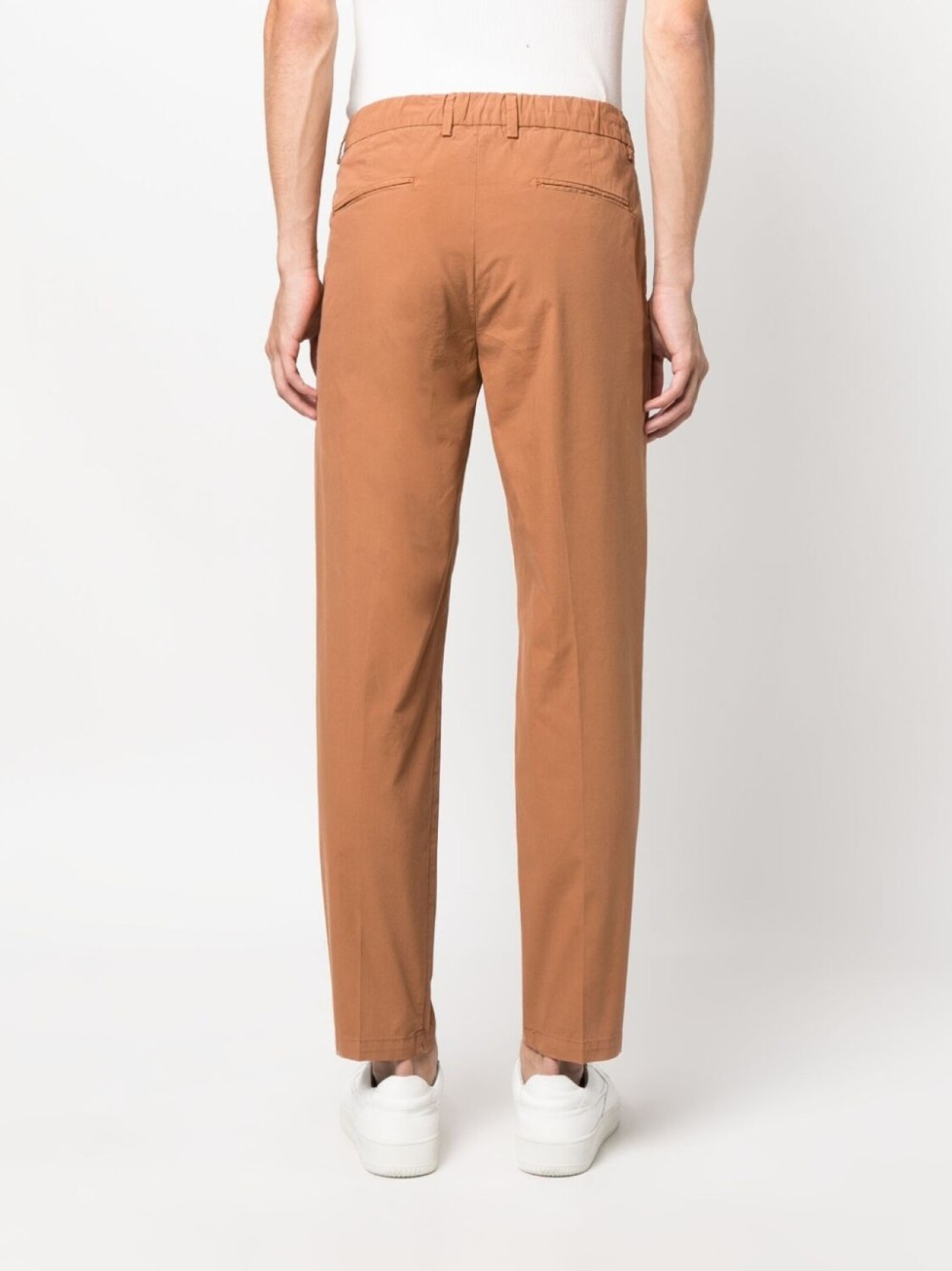 Оранжево-коричневый, хлопок, встречная складка, строчка в тон, средняя посадка, потайная застежка на молнии и пуговицах, эластичный пояс сзади, прямой крой, петли для ремня, два прорезных кармана по бокам, два прорезных кармана сзади и прямой подол.