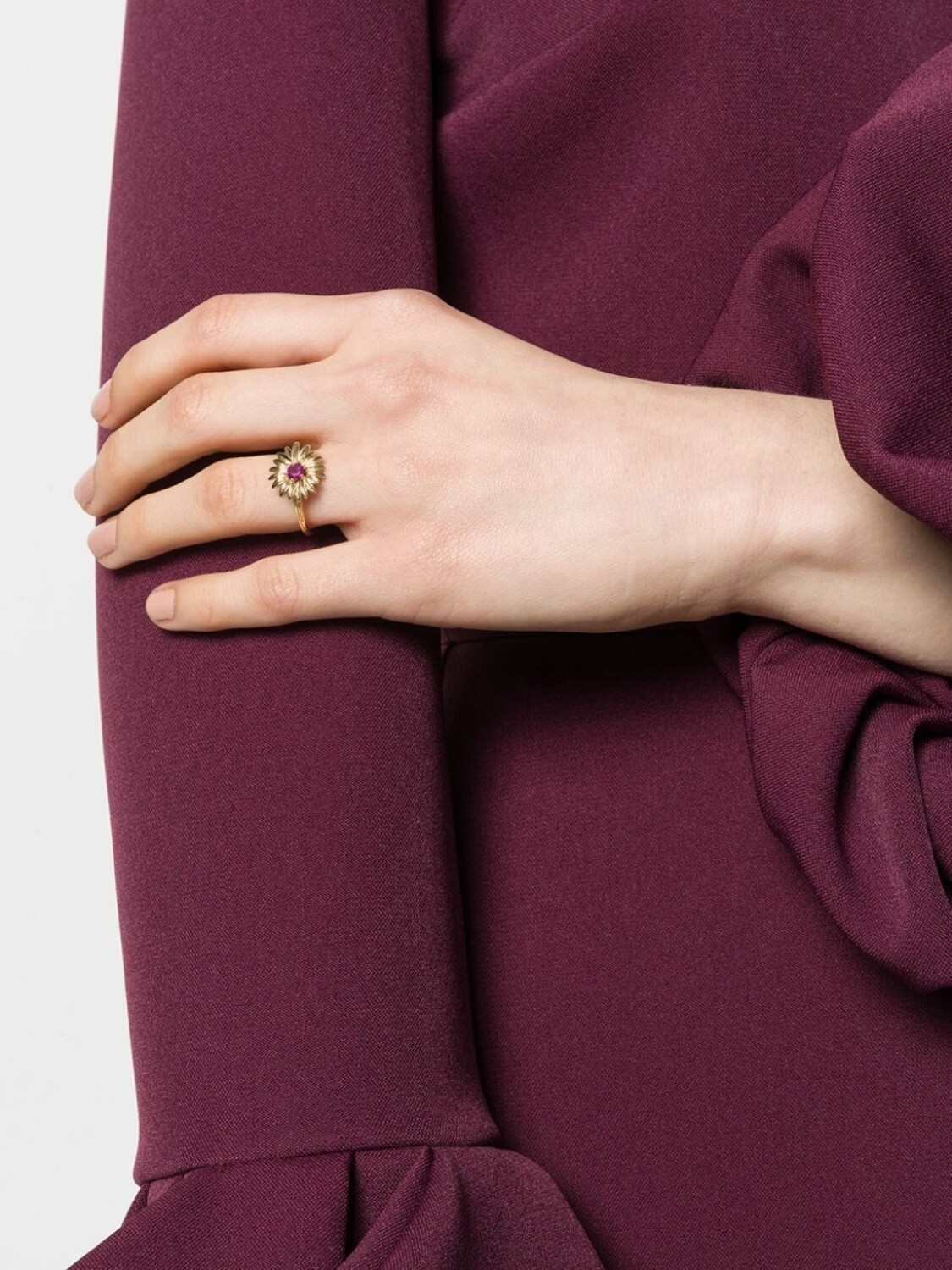 Кольцо из 18-каратного желтого золота с цветком со вставкой из граната от Aurelie Bidermann. Декор в форме ромашки с гранатом в центре.