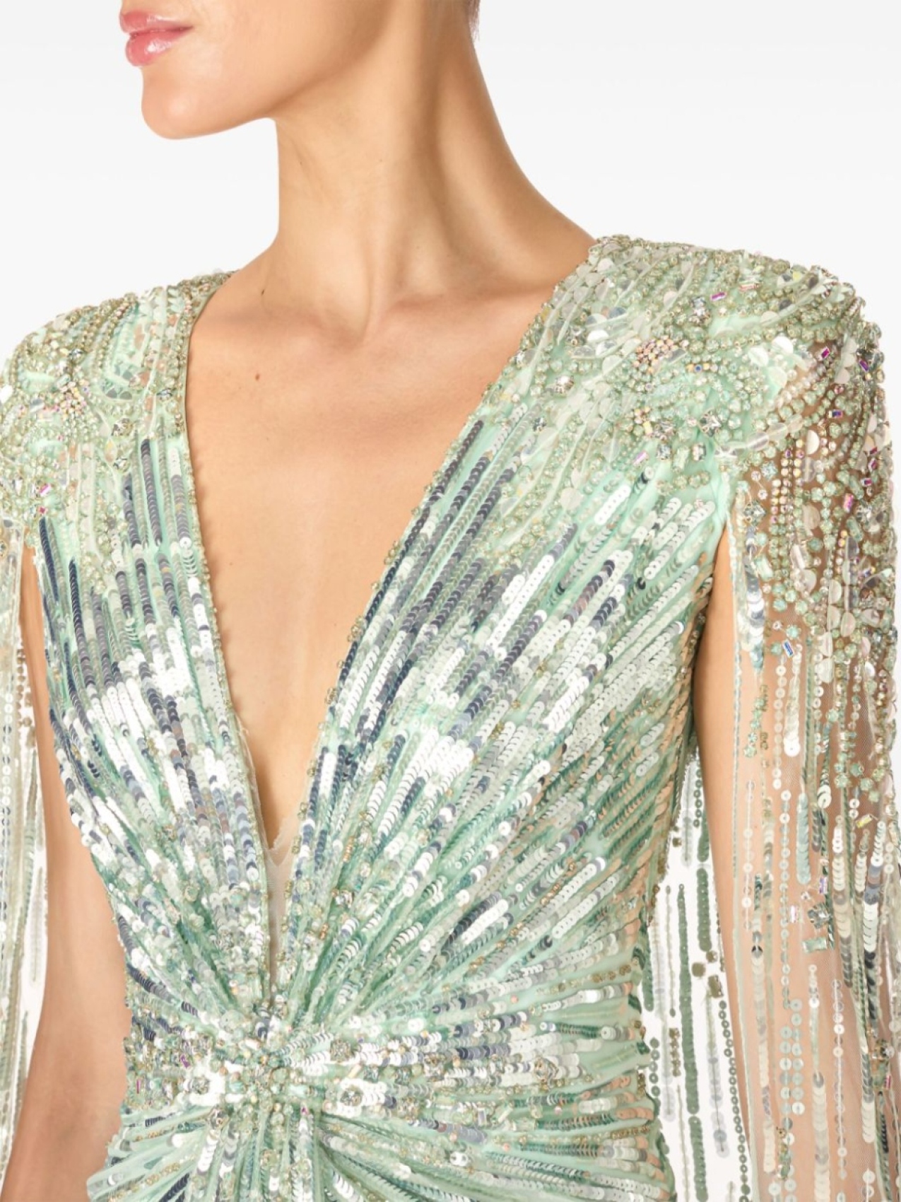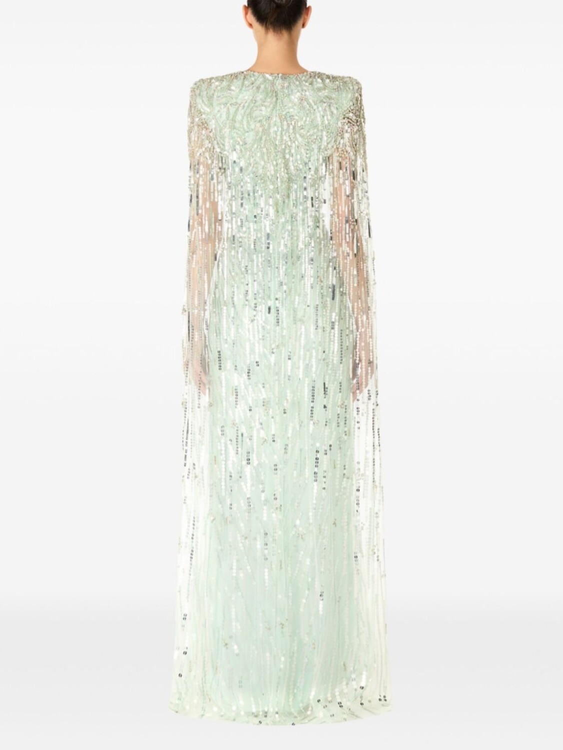 Зеленый, украшение из пайеток, потайная застежка на молнии сзади, глубокий V-образный вырез, кейп, прямой подол, длина макси