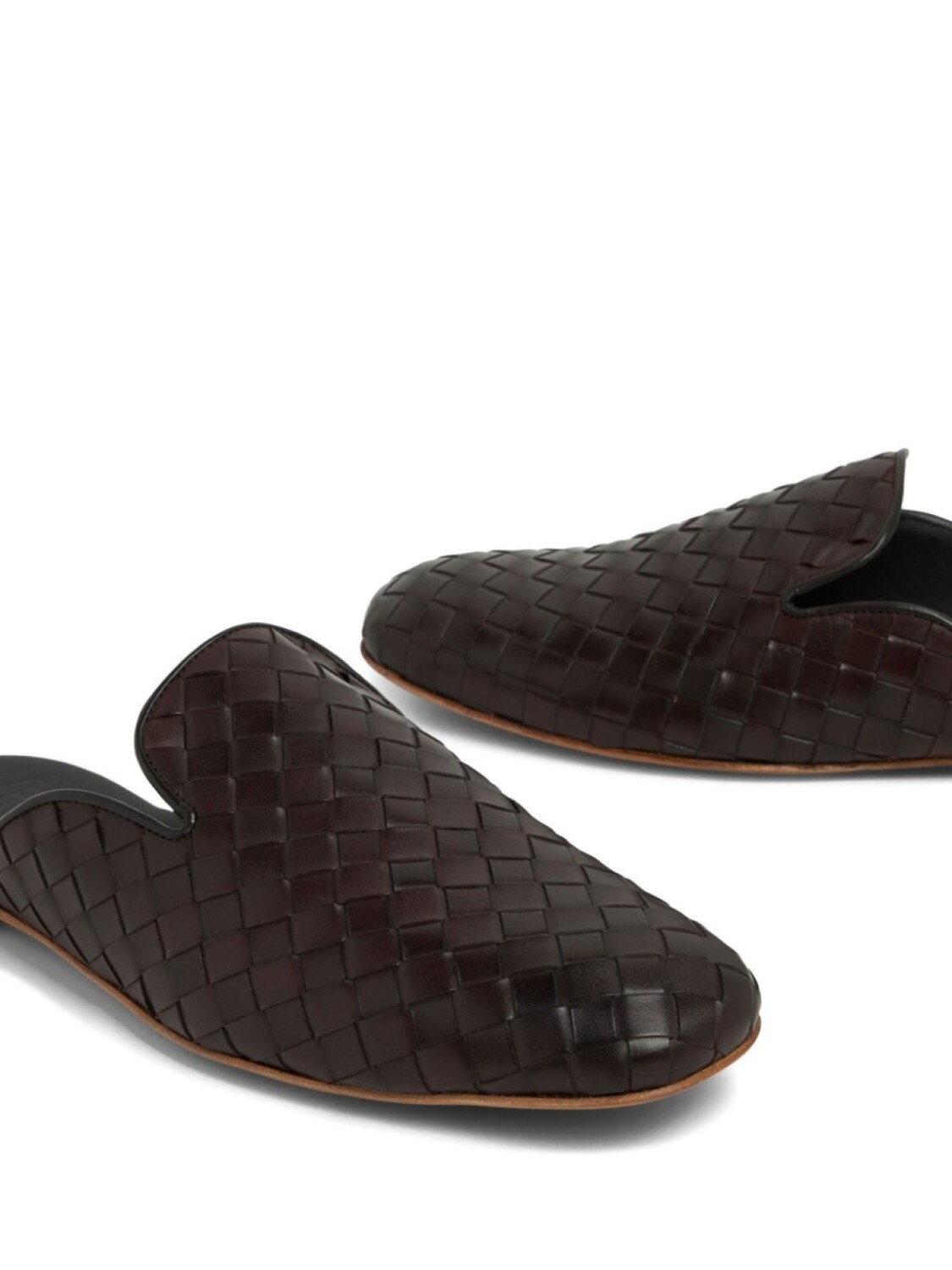 Коричневый, кожа, модель без застежки, переплетенный дизайн, миндалевидный носок, стелька с логотипом и плоская резиновая подошва.
