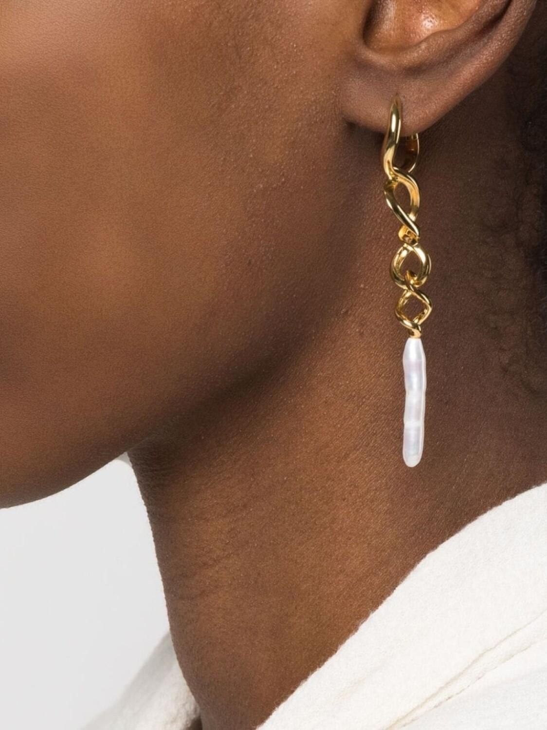 Золотистый, переработанное серебро, покрытие из 22-каратного золота, перекрученная деталь, серьги-подвески, вставки из пресноводного жемчуга, глянцевая фактура и для проколотых ушей. Одиночная серьга на левое ухо.
