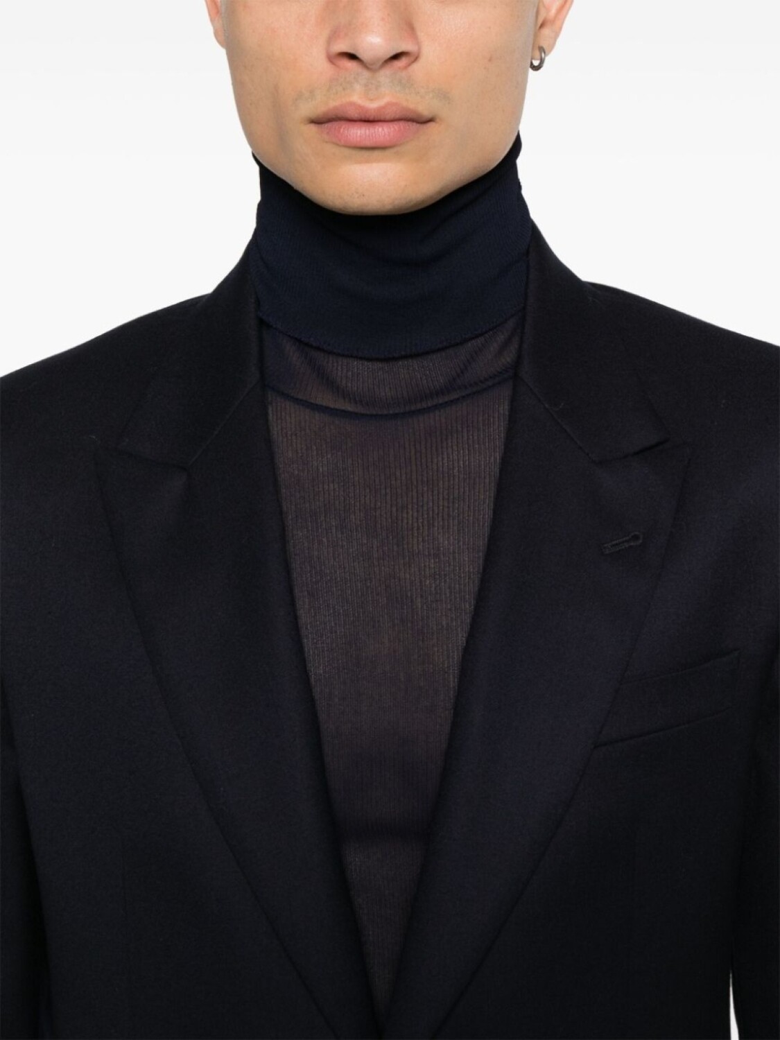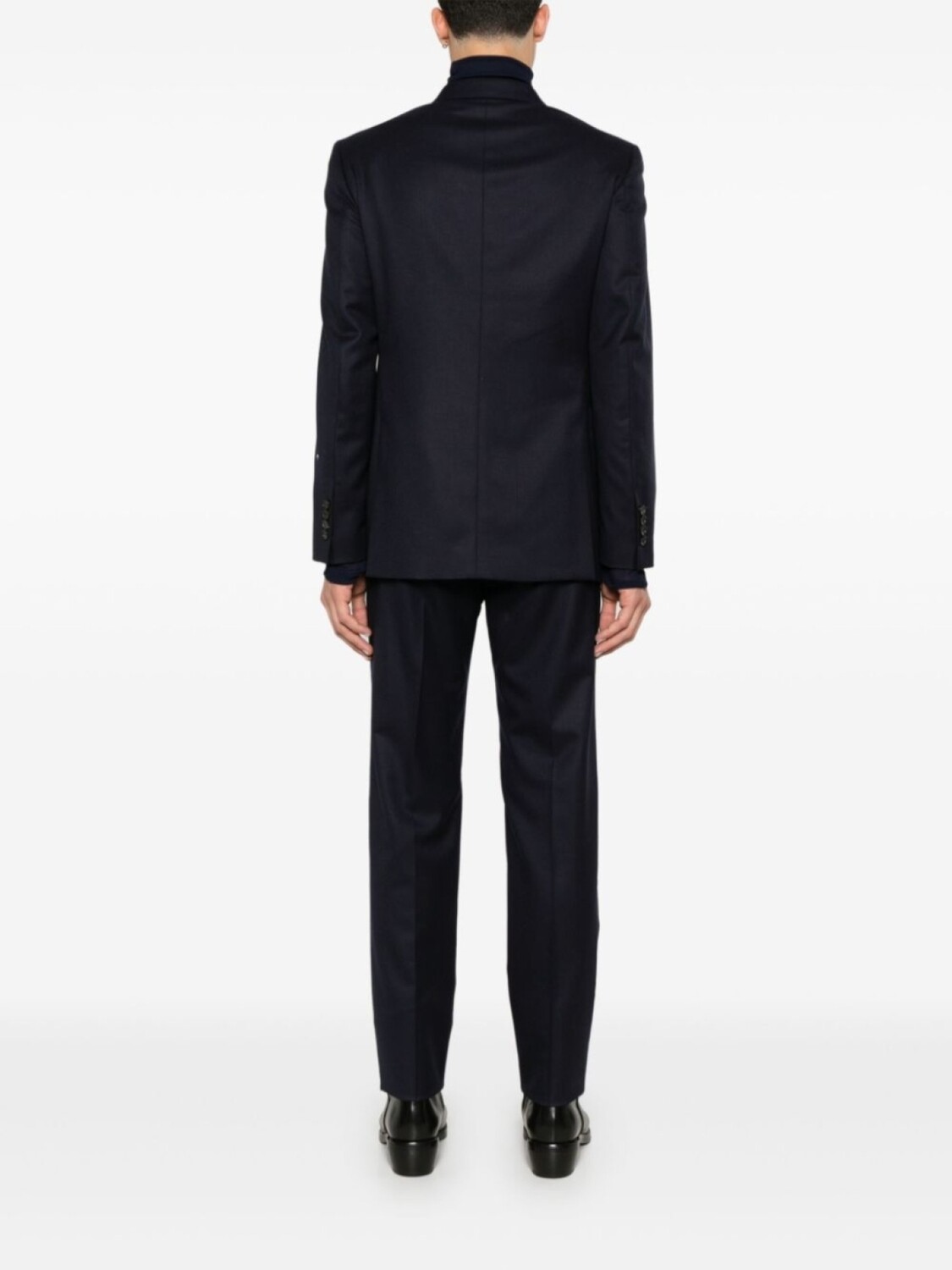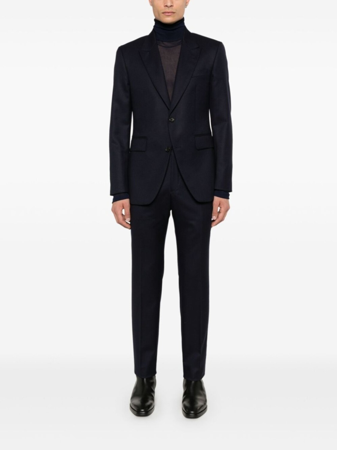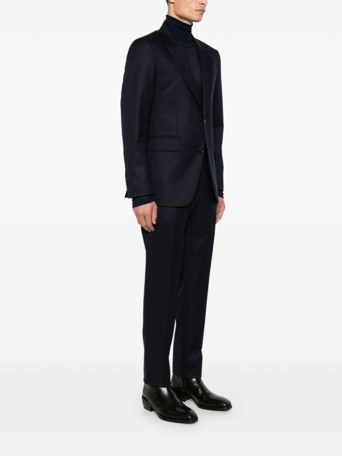 Подробнее о товаре: • темно-синий • застежка на пуговицах спереди • заостренные лацканы • подплечники • длинные рукава • манжеты на пуговицах • прорезной карман на груди • два передних кармана с клапанами • две боковые шлицы сзади • цельная подкладка • классический крой • ширинка на пуговицах • петли для ремня • два прорезных кармана по бокам • два прорезных кармана на пуговицах сзади • стрелки • зауженный крой • необработанный подол