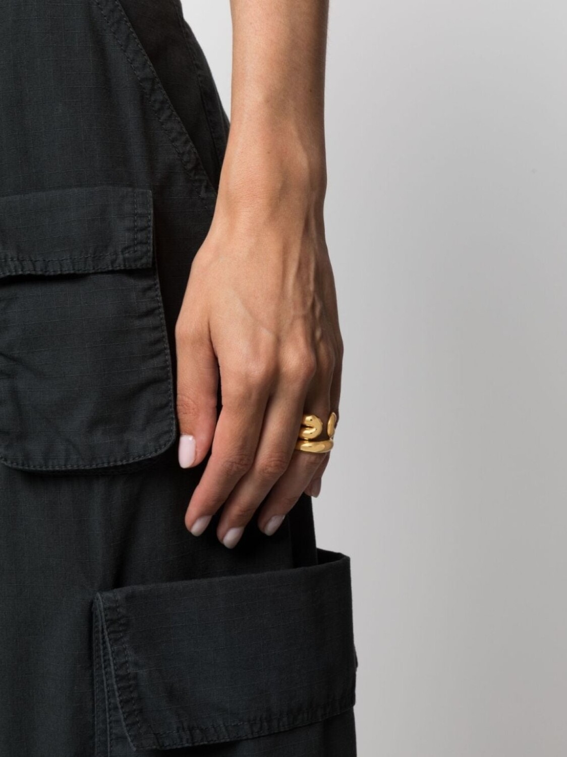 Золотистый, серебро с покрытием из переработанного 18-каратного золота, глянцевое покрытие, кольца скульптурной формы и выгравированный логотип.