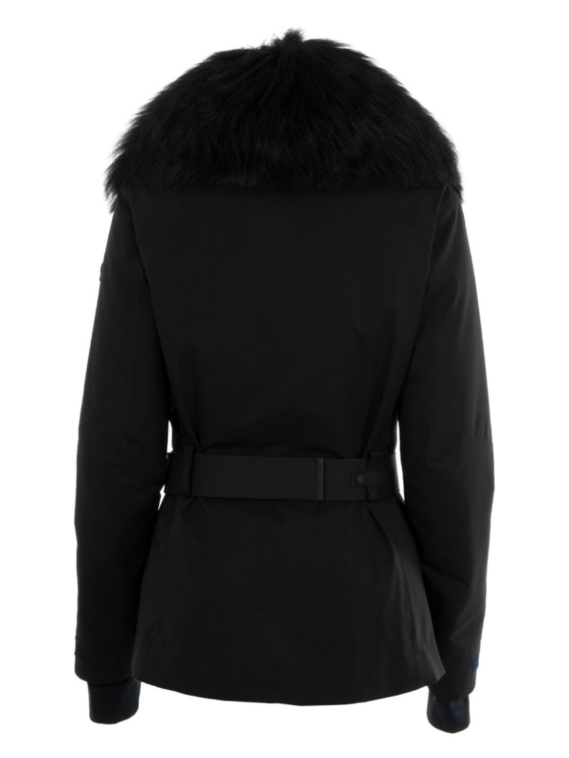 Черный, водонепроницаемый материал GORE-TEX, двусторонняя молния, мех на воротнике, съемный пояс, передний карман с клапаном, длинные рукава, карман с молнией на рукаве, логотип-аппликация, прямой подол