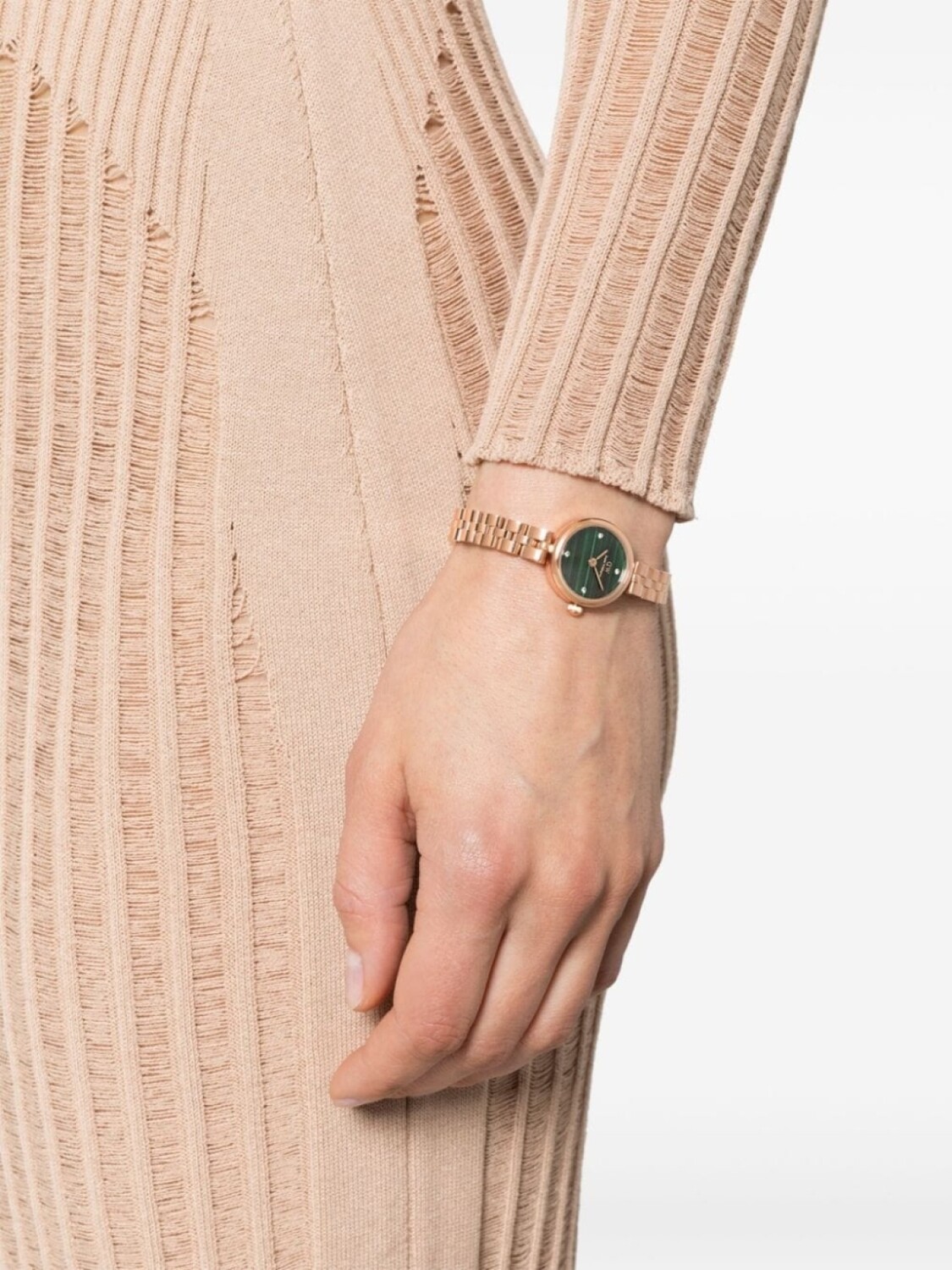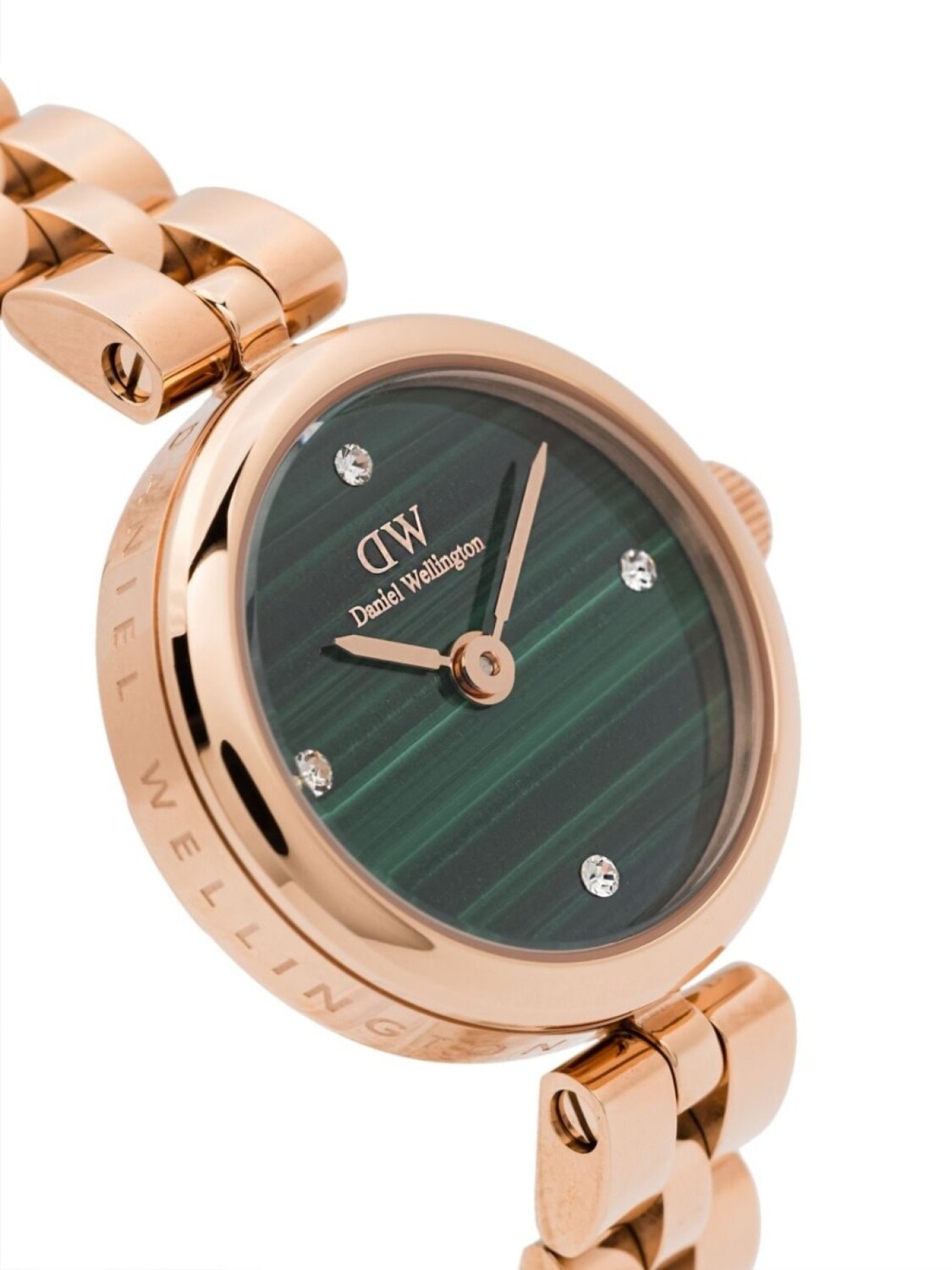 Подробнее о товаре: • 22 мм • нержавеющая сталь • покрытие из розового золота • кварцевый механизм • юнитонный циферблат с кристаллами • мечевидные стрелки • круглый корпус • малахит • логотип • безель с гравированным логотипом • завинчивающаяся заводная коронка • гравировка на задней крышке • подвижные звенья • застежка на зажиме • водонепроницаемость до 30 метров/3 АТМ