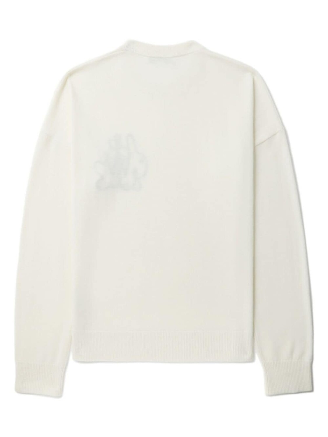 Кремовый, шерсть мериноса, трикотажный материал, тонкая вязка, логотип в технике интарсия, круглый вырез, длинные рукава и прямой подол.