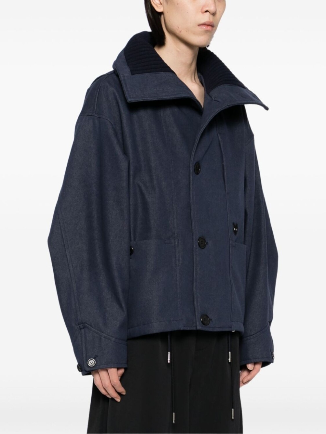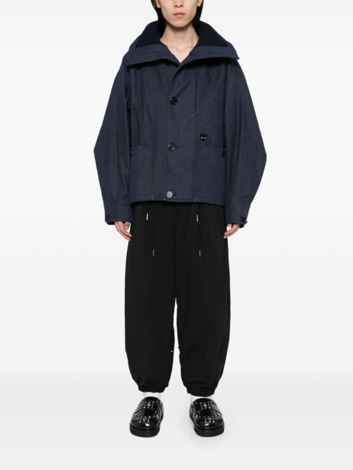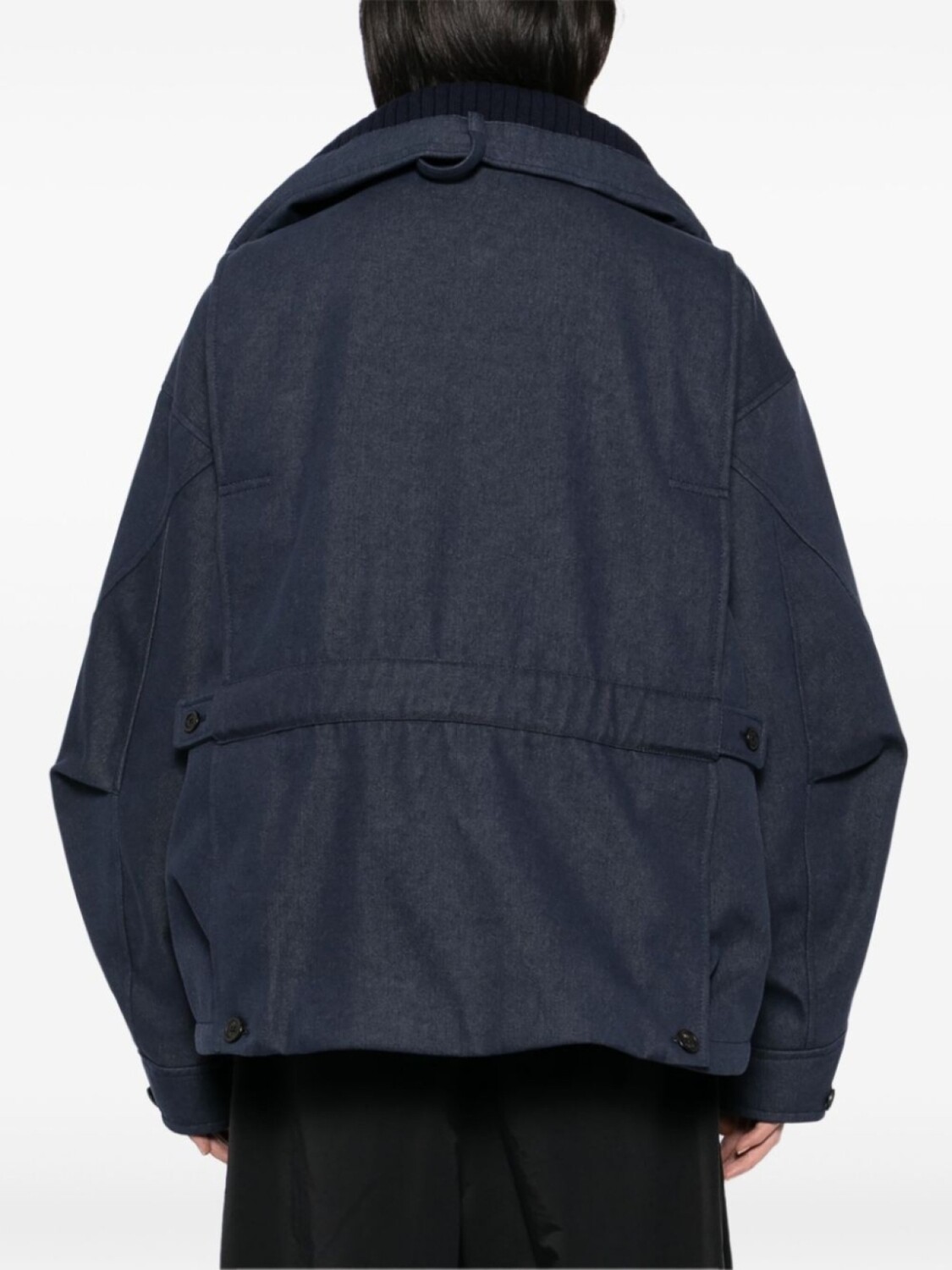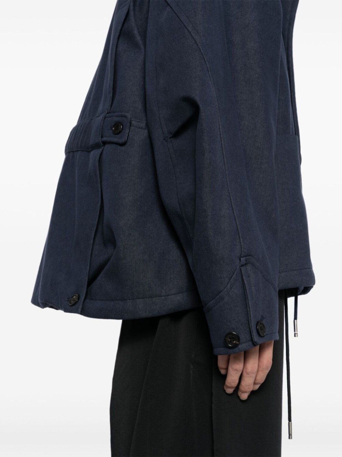 Темно-синий, смесовый хлопок, застежка на пуговицах спереди, нашивка, два кармана на пуговицах спереди, воротник-стойка в рубчик, длинные рукава, манжеты на пуговицах, подол с кулиской, цельная подкладка