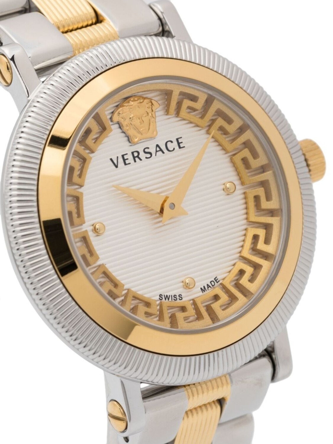 Нержавеющая сталь, кварцевый механизм, знаковый орнамент Greca, узор Medusa Head, заостренные стрелки, браслет из нержавеющей стали и застежка-бабочка.