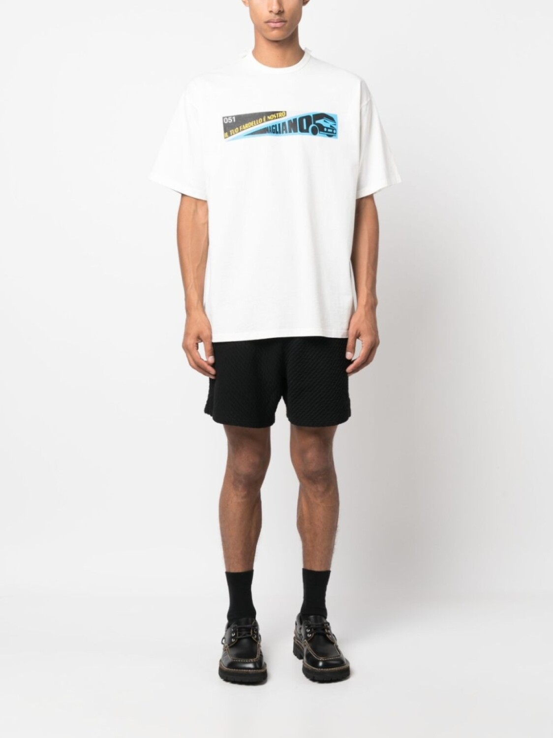 Белый, хлопок, графичный принт спереди, графичный принт на спине, круглый вырез, приспущенные плечи, короткие рукава и прямой подол.