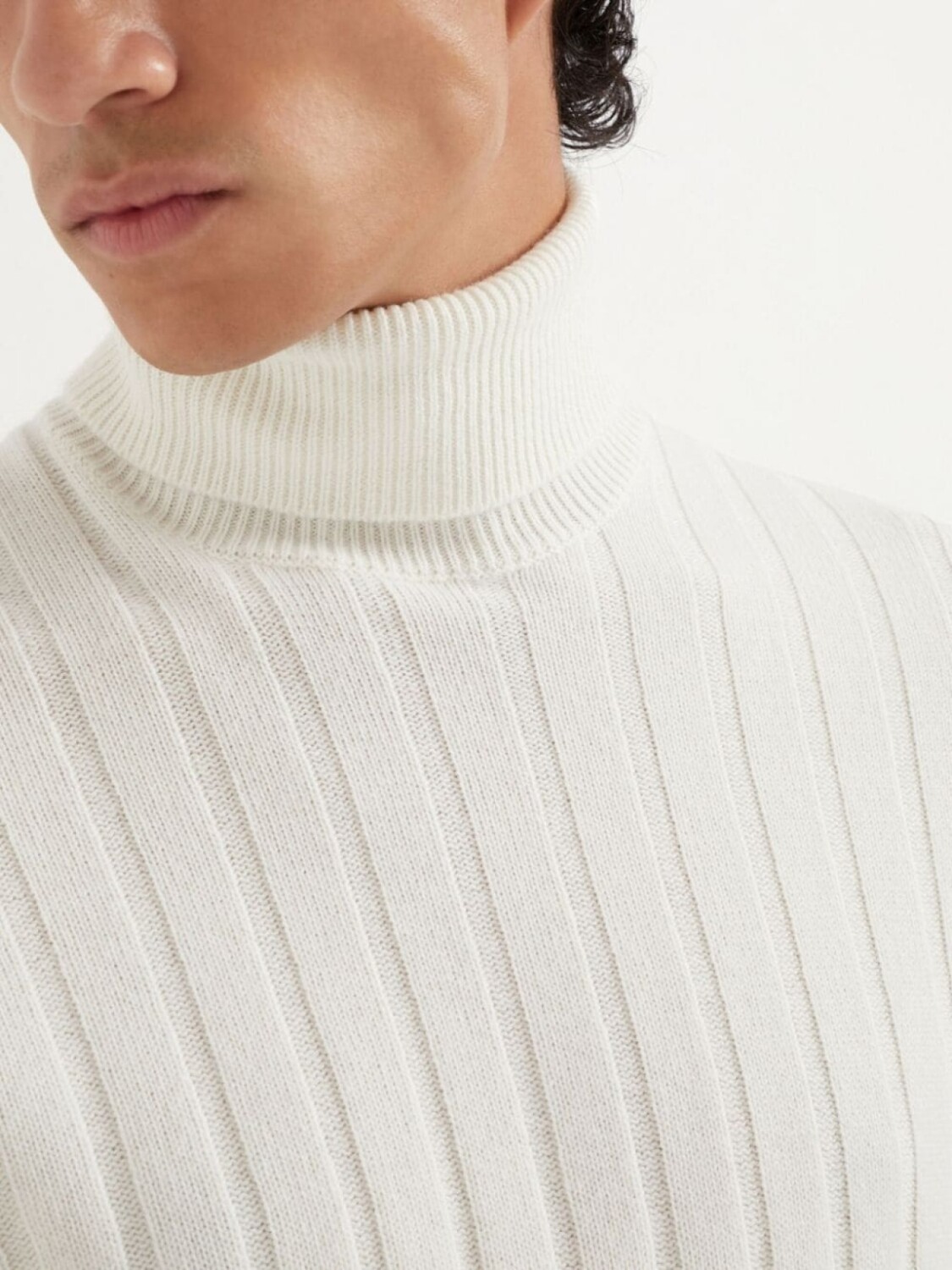 Белый, кашемир, трикотаж в рубчик, высокий воротник, длинные рукава, прямой подол