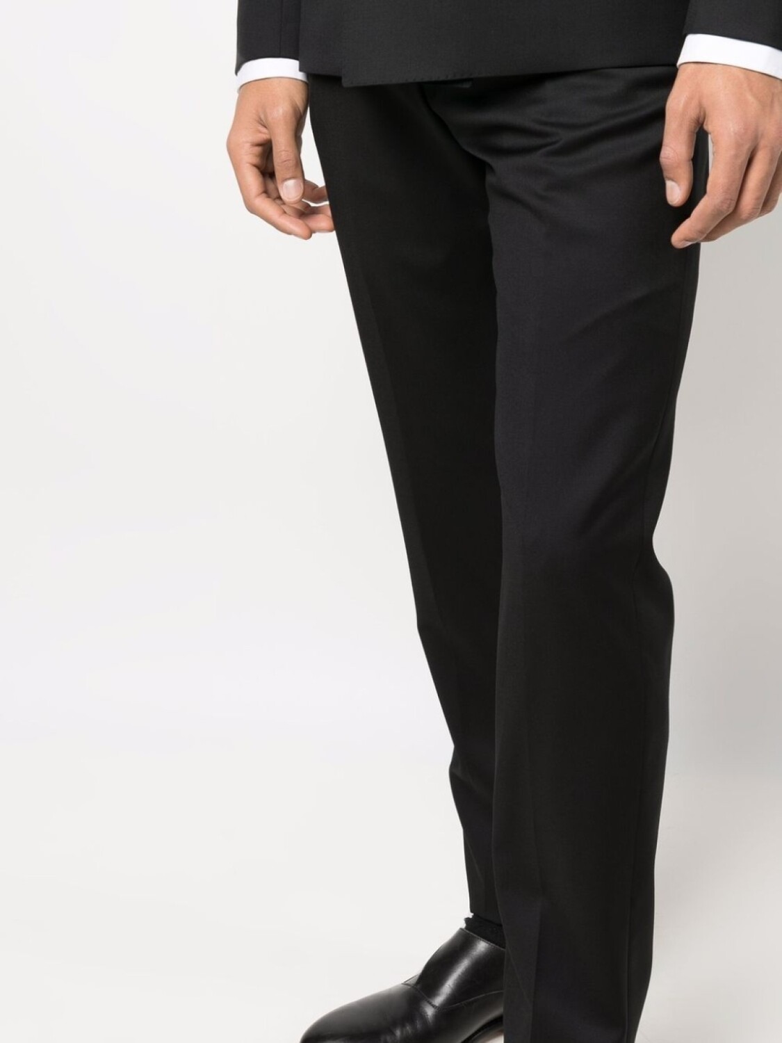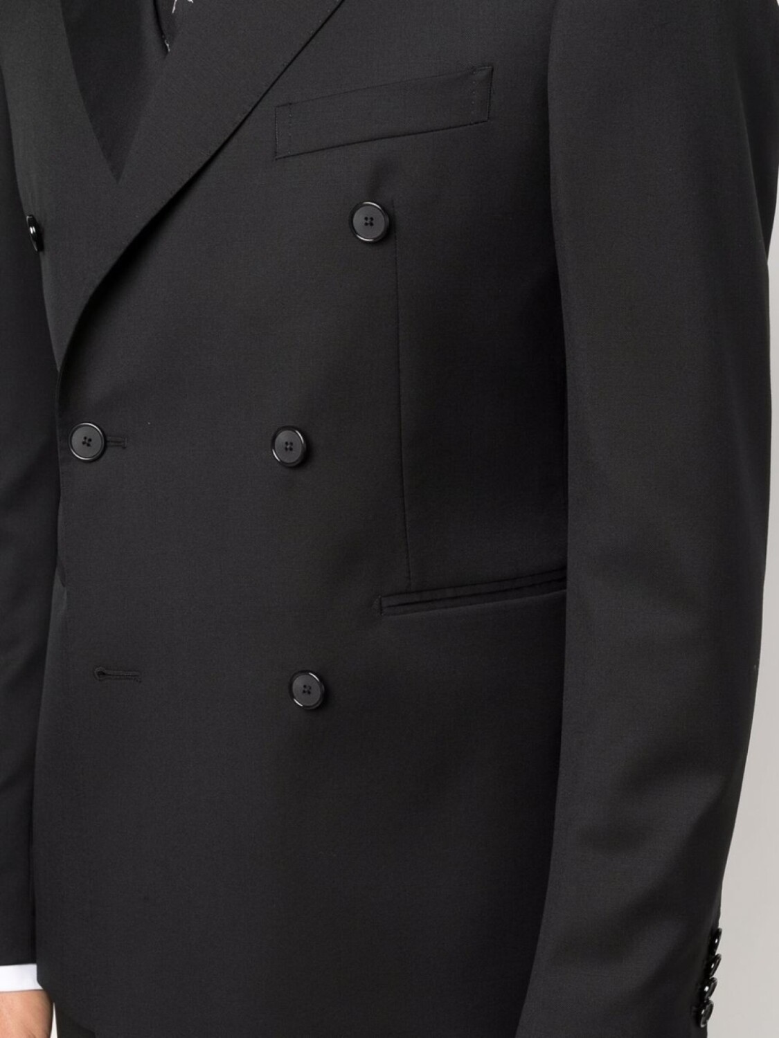 Классические лацканы, двубортная застежка на кнопки, длинные рукава, прорезной карман на груди, два передних кармана с листочкой, петли для ремня, потайная застежка спереди, два вшитых кармана по бокам и два кармана с листочкой сзади. Цвет: черный.