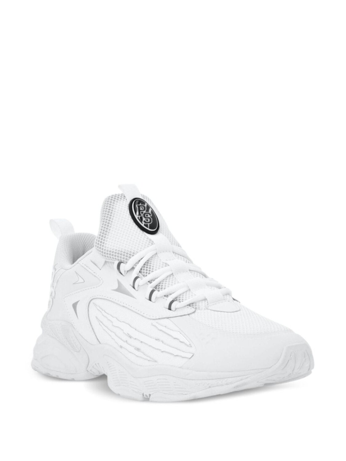 Белый, дизайн со вставками, сетчатые вставки, логотип сбоку, нашивка с логотипом на язычке, петля для подтягивания на язычке и сзади, закругленный носок, шнуровка спереди, массивная резиновая подошва