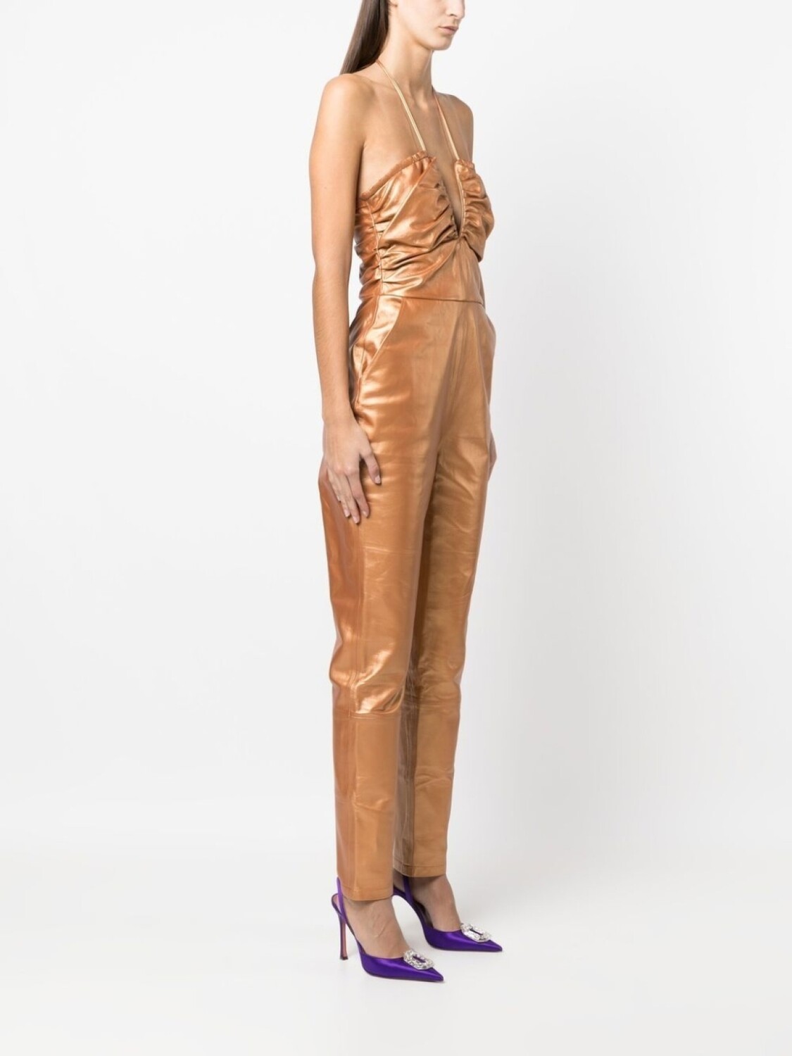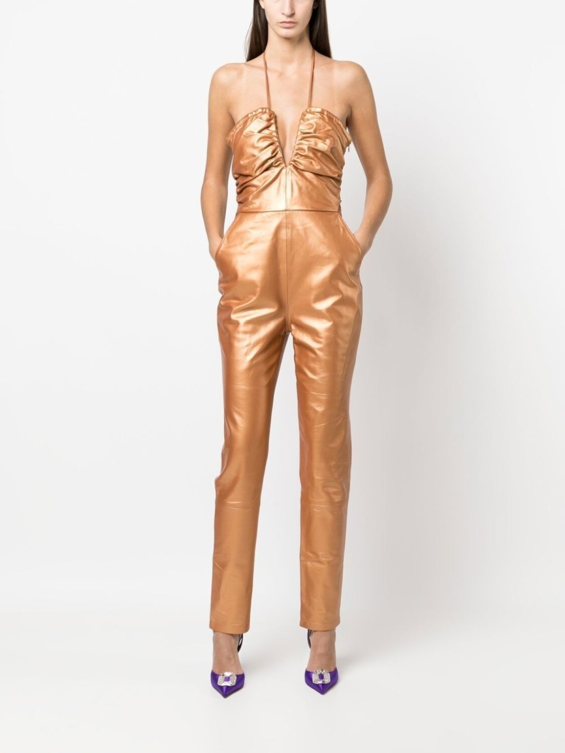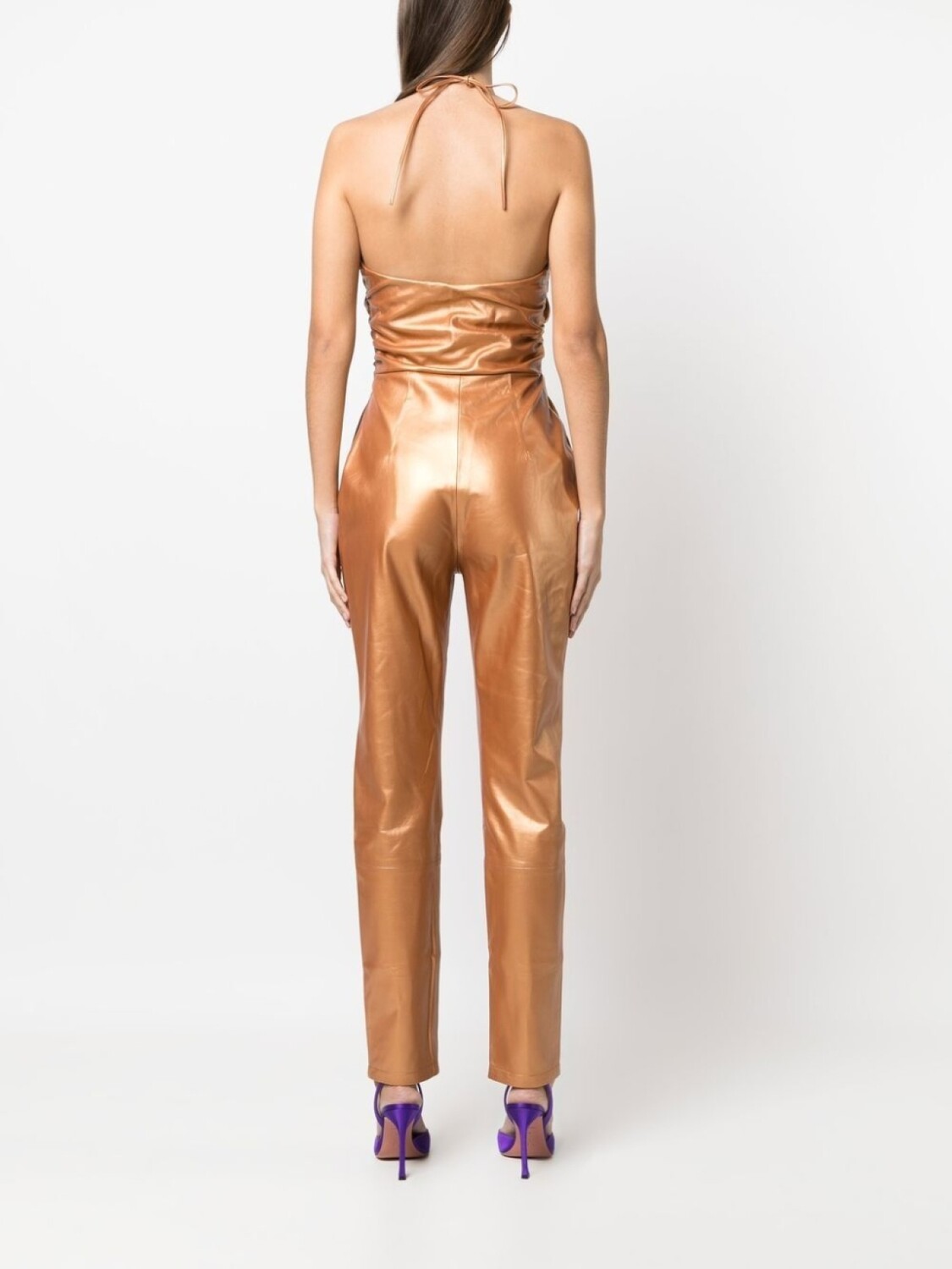 Золотистый, овечья кожа, шелк, покрытие с эффектом металлик, детали с оборками, завязки вокруг шеи, открытая спина, глубокий V-образный вырез и два прорезных кармана по бокам.
