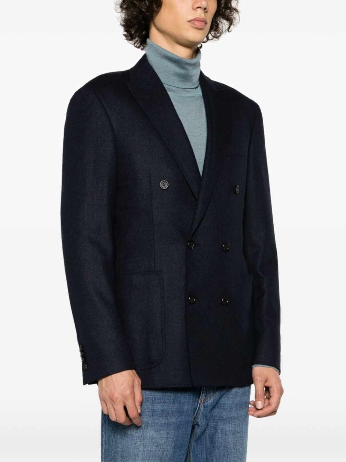 Темно-синий, эластичная шерсть, заостренные лацканы, двубортная застежка на кнопки, прорезной карман на груди, четыре накладных кармана спереди, длинные рукава, рукава с манжетами на пуговицах и прямой подол.