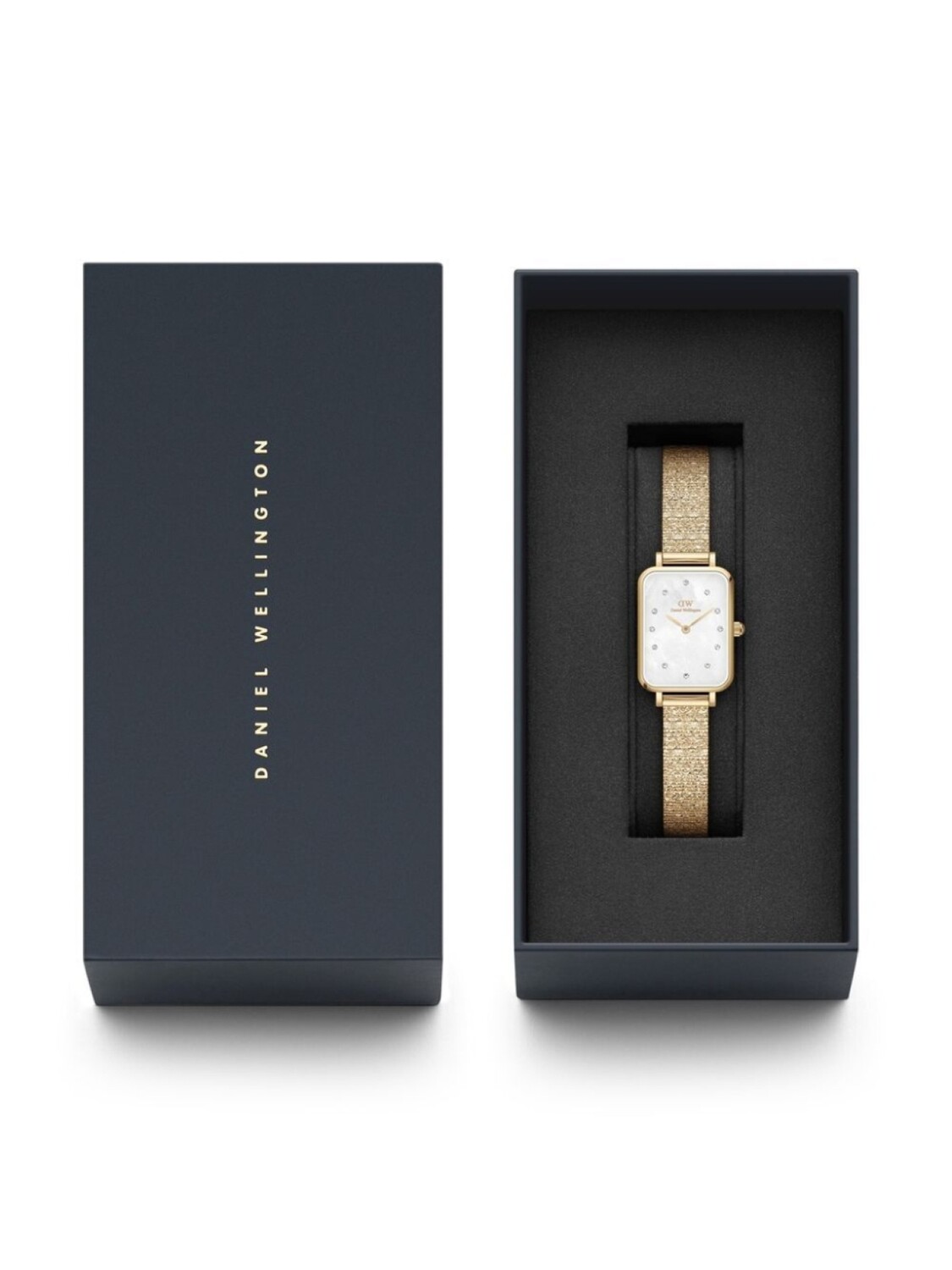Корпус из нержавеющей стали, позолота, кварцевый механизм, хрустальные часовые индексы, квадратный корпус, прямоугольные вытянутые стрелки, логотип, завинчивающаяся заводная коронка, плетеный браслет и складная застежка.