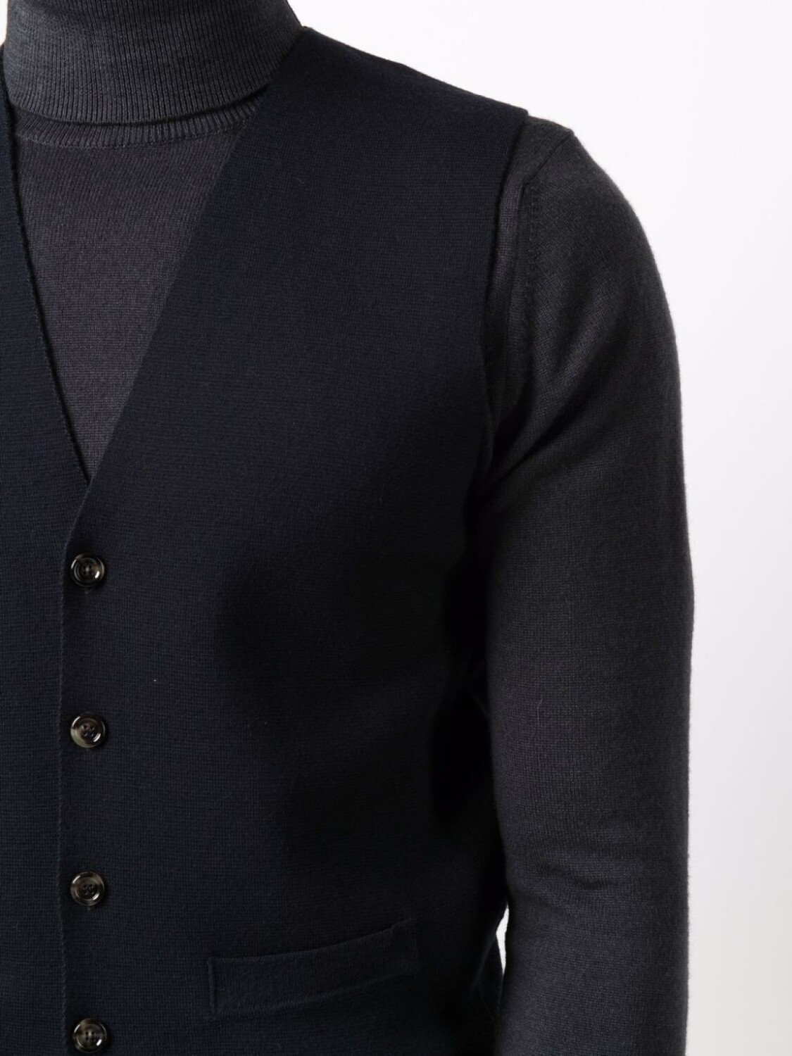 V-образный вырез, застежка на пуговицах спереди, без рукавов, два накладных кармана спереди и прямой подол.