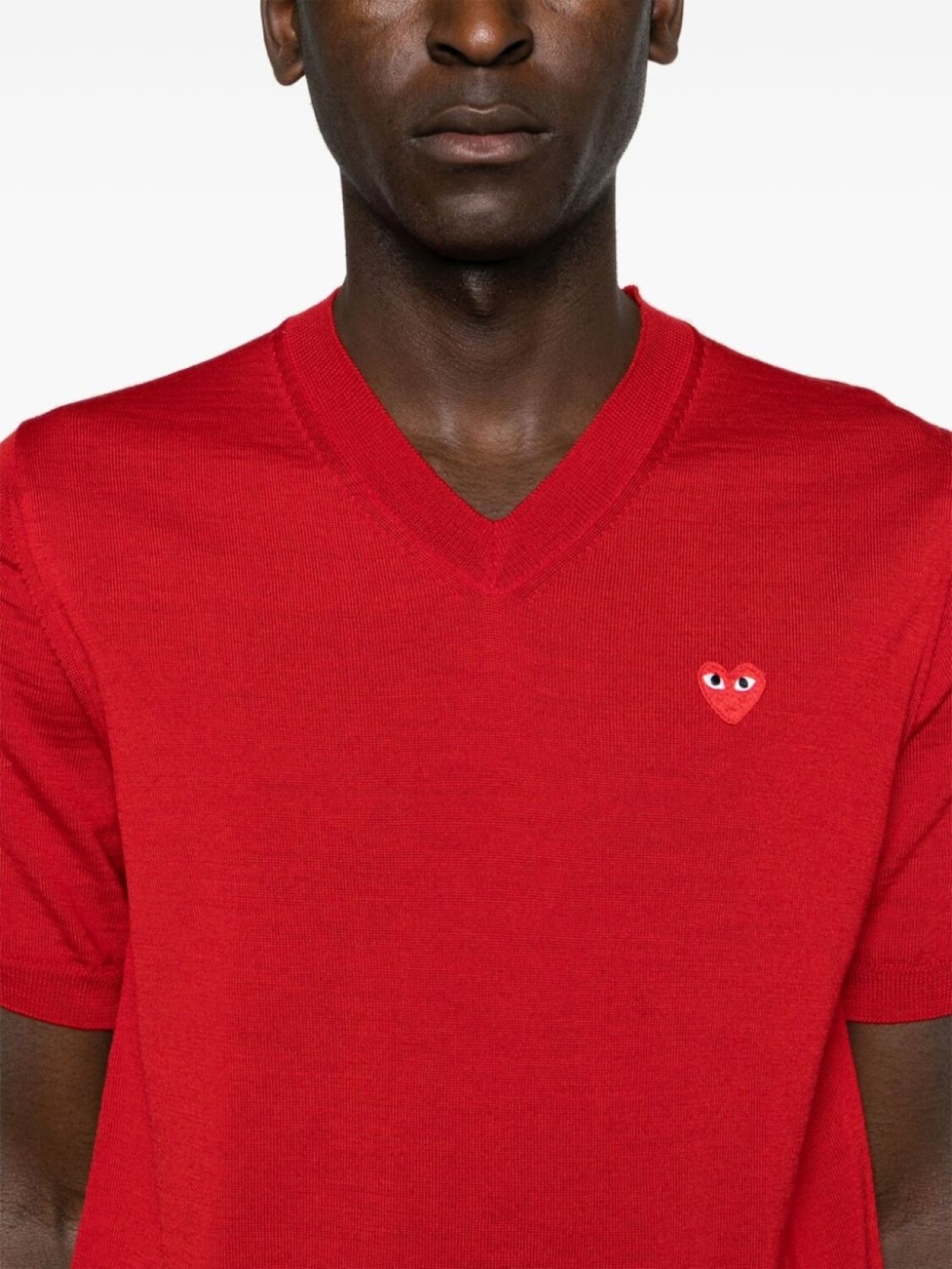 Красный, шерсть, тонкая вязка, нашивка с логотипом в форме сердца, V-образный вырез в рубчик, короткие рукава, подол и манжеты в рубчик, прямой подол, Это унисекс-модель. Обратите внимание, что для нее используется мужская размерная сетка.