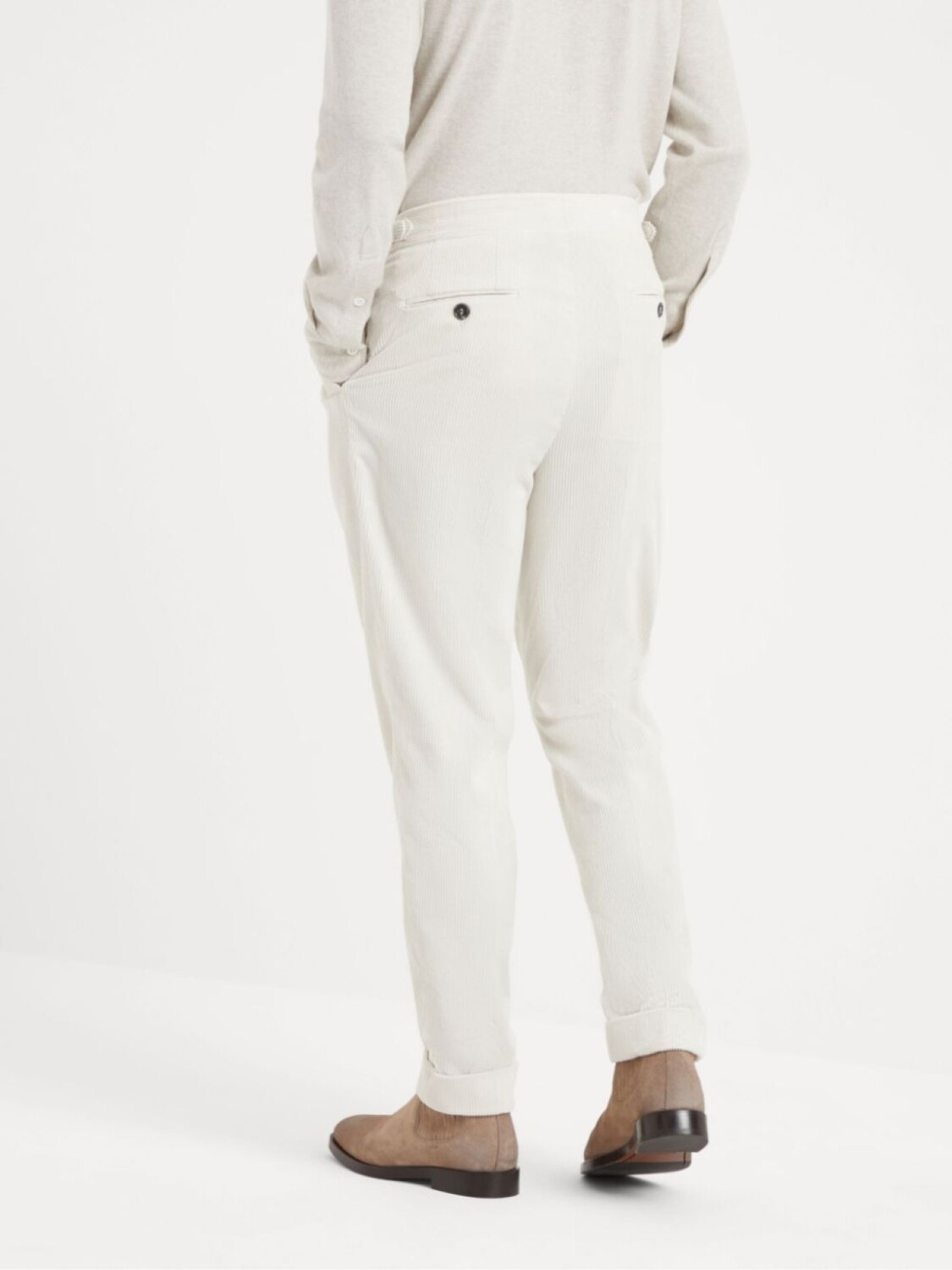 Белый вельвет из смеси хлопка и кашемира, потайная застежка на пуговицы и ширинку, застежка на пряжку сбоку, средняя часть талии, складки, передний карман с клапаном, два боковых врезных кармана, два задних кармана на пуговицах, отворот, зауженные штанины