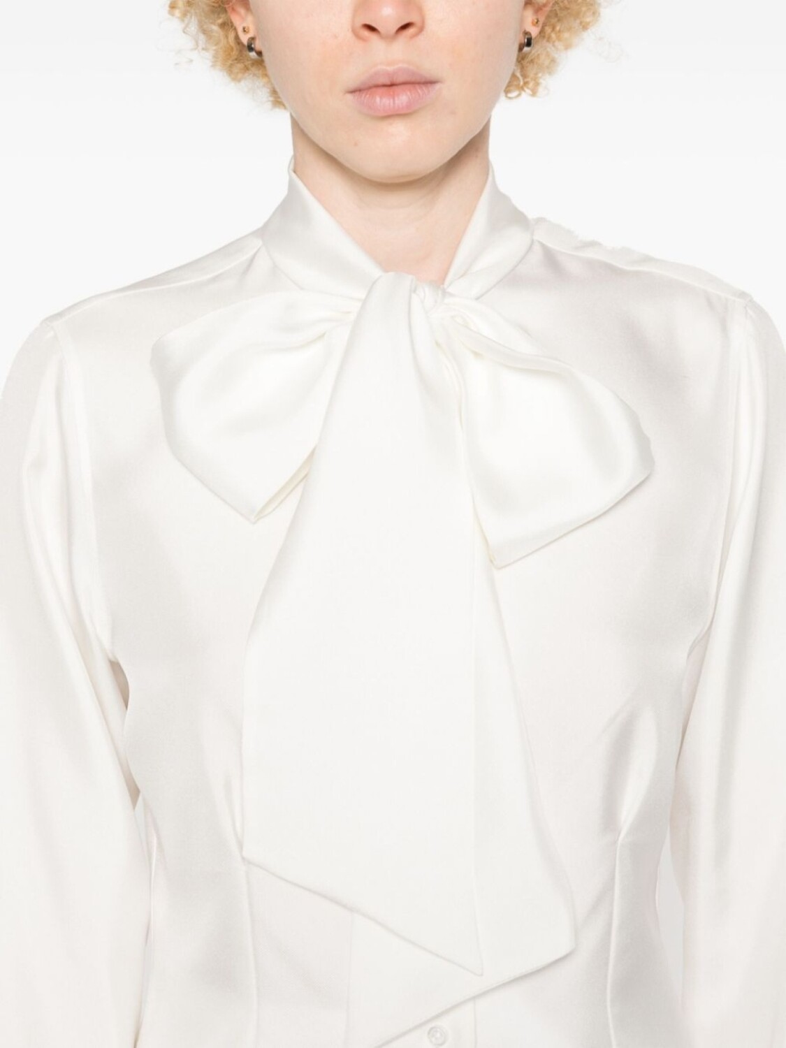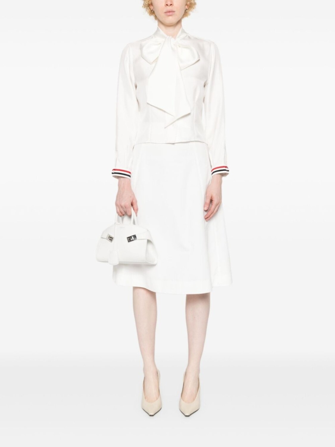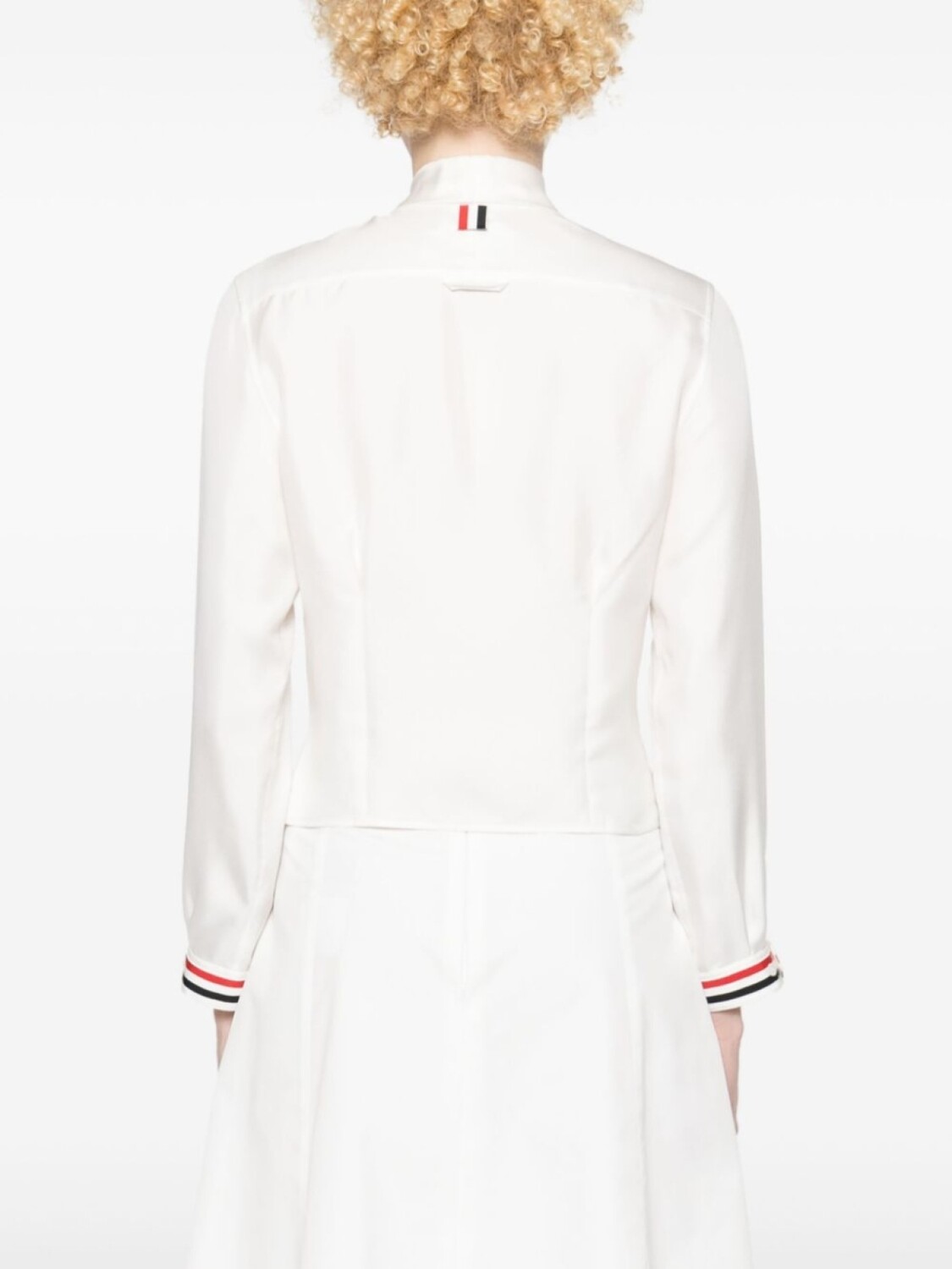 Белый, шелк, сатиновая фактура, воротничок с бантом, длинные рукава с манжетами на пуговицах, полоска RWB на манжетах, защипы, петля сзади, петля на внутренней стороне, прямой подол, застежка на пуговицах спереди