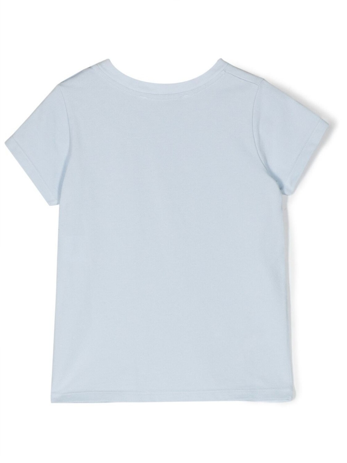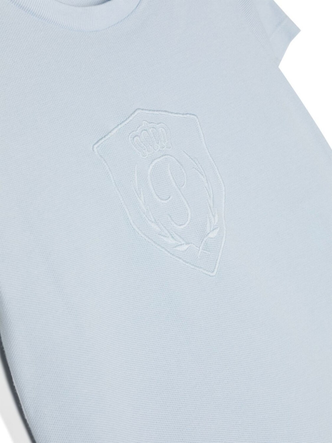 Пастельно-синий, хлопок, вышитый логотип, круглый вырез и короткие рукава.