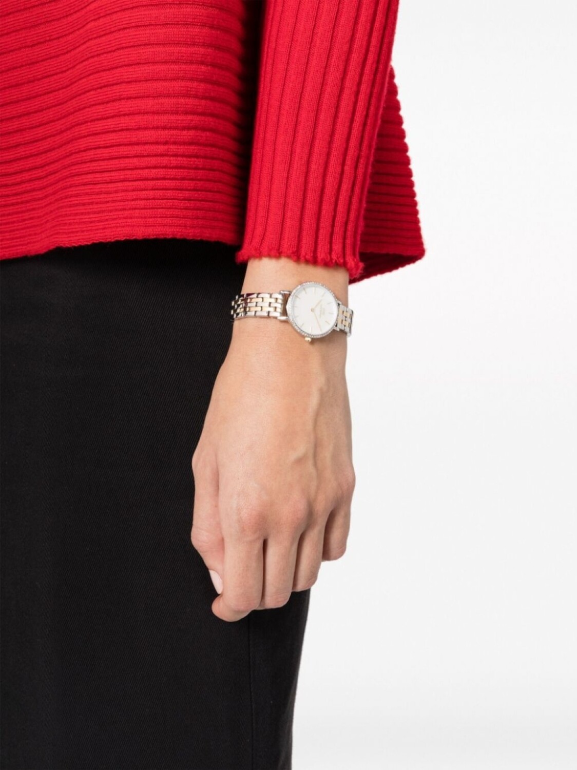 Корпус из нержавеющей стали, кварцевый механизм, прямоугольные вытянутые индексы, белый, круглый корпус, инкрустированный кристаллами безель, тонкие закругленные стрелки, серебристый, золотистый, браслет из нержавеющей стали, застежка-клипса и водонепроницаемость до 30 метров/3 АТМ.