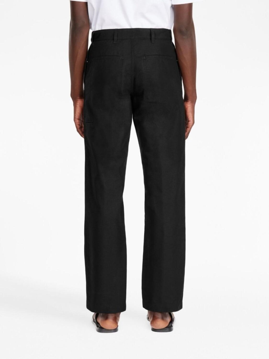 Черный, смесовый хлопок, застежка на молнии и пуговице спереди, петли для ремня, задние карманы с листочкой и прямой крой.