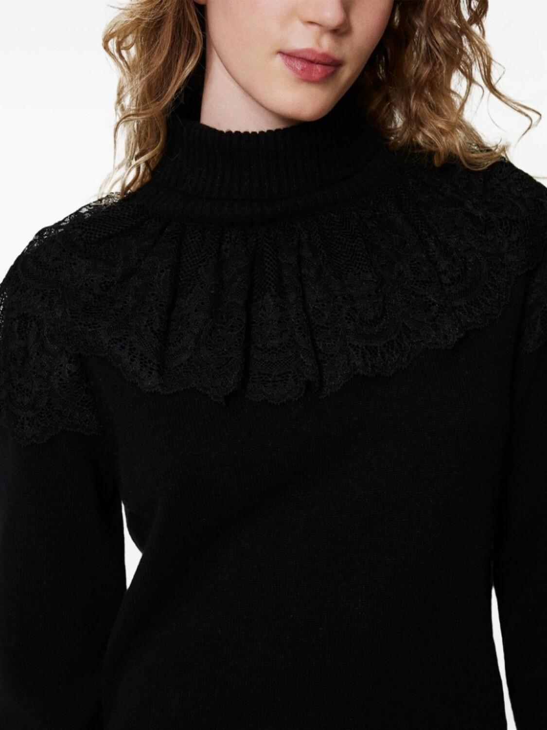 Черный, смесовая шерсть, вязаный дизайн, высокий воротник, вставки из кружева, вставки с оборками, длинные рукава, подол и манжеты в рубчик