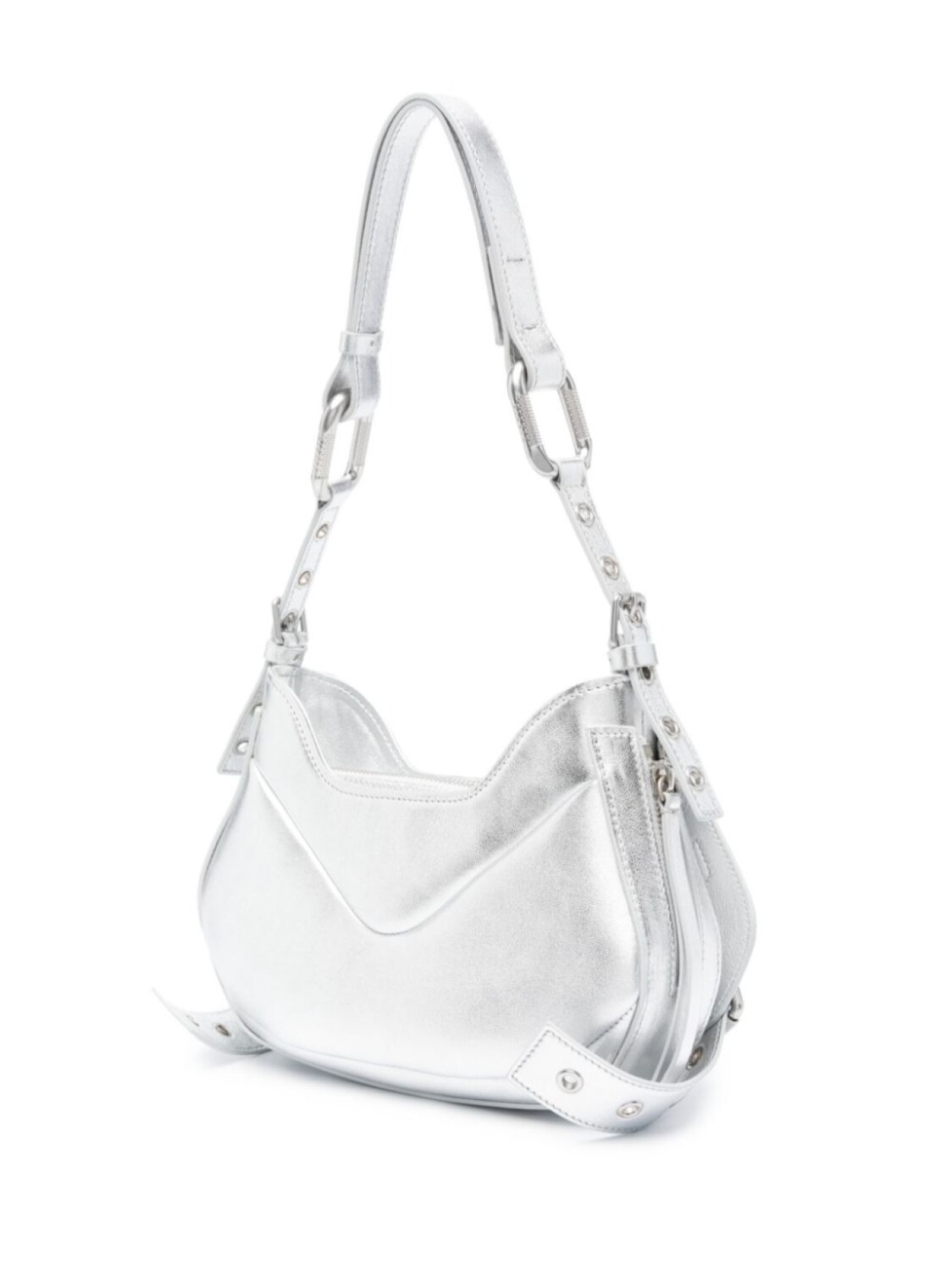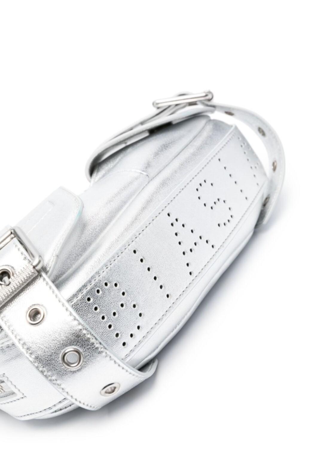 Серебристый, хлопок/кожа, эффект металлик, нашивка с логотипом внутри, серебристая фурнитура, перфорация, застежка на молнии сверху, застежка на пряжке, регулируемый ремень на плечо, основное отделение и два передних кармана с клапанами.