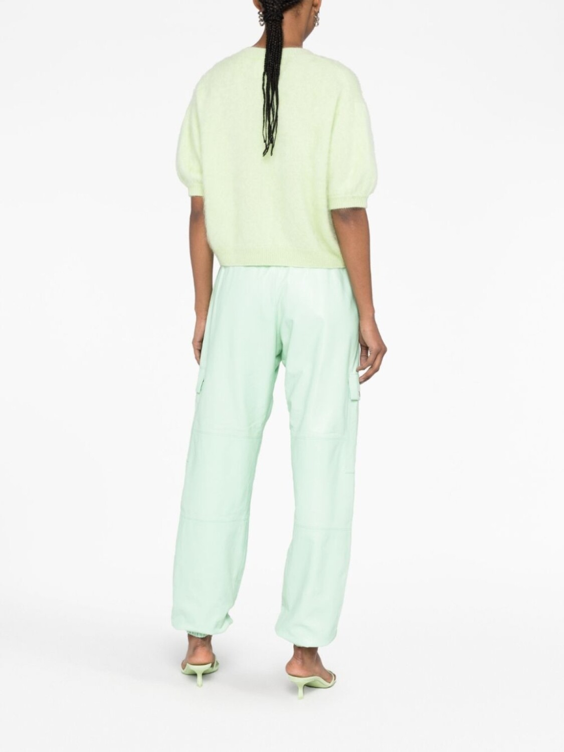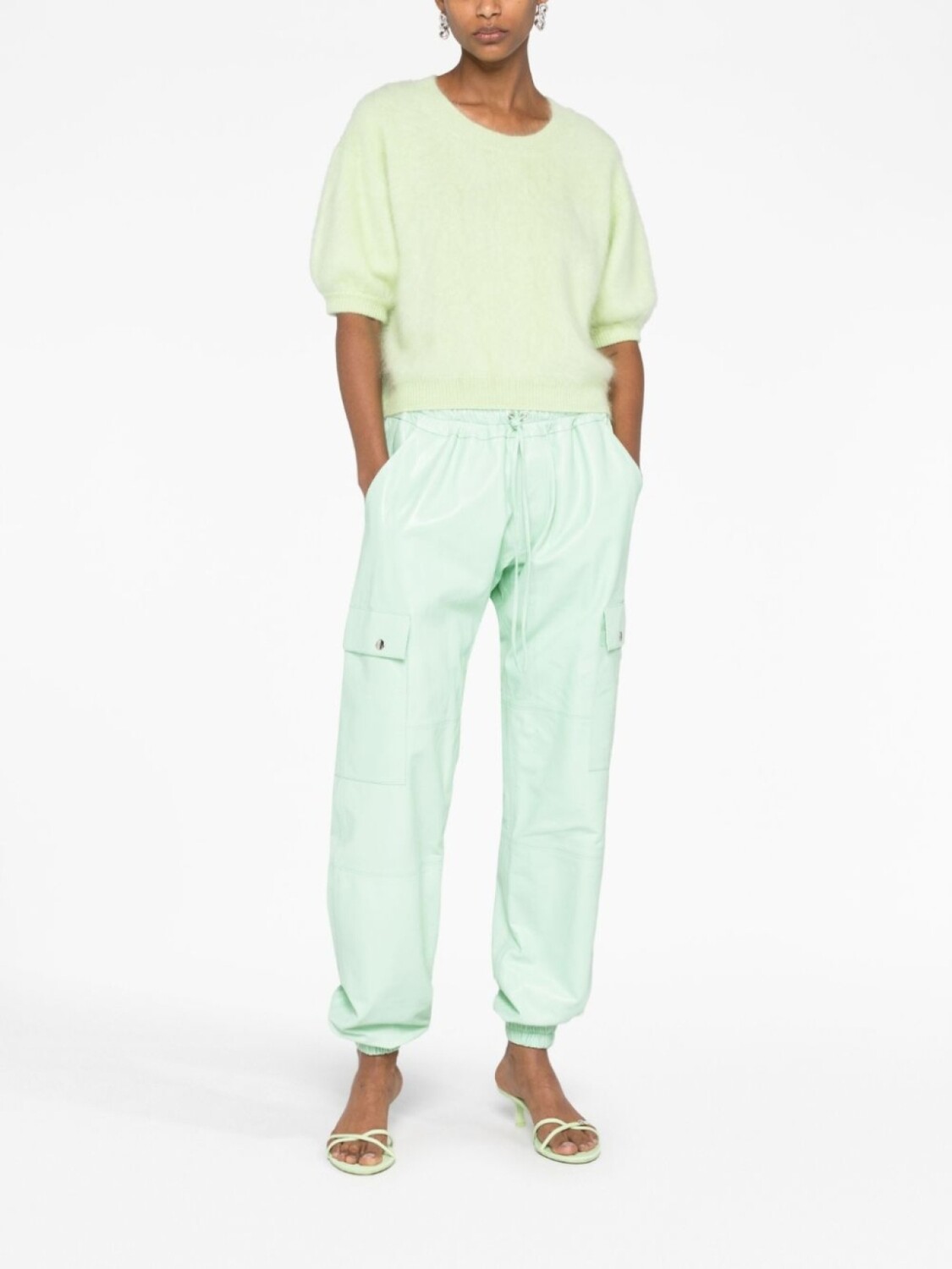 Мятно-зеленый, кожа, кулиска на талии, два прорезных кармана по бокам, два кармана с клапанами по бокам и эластичные манжеты.
