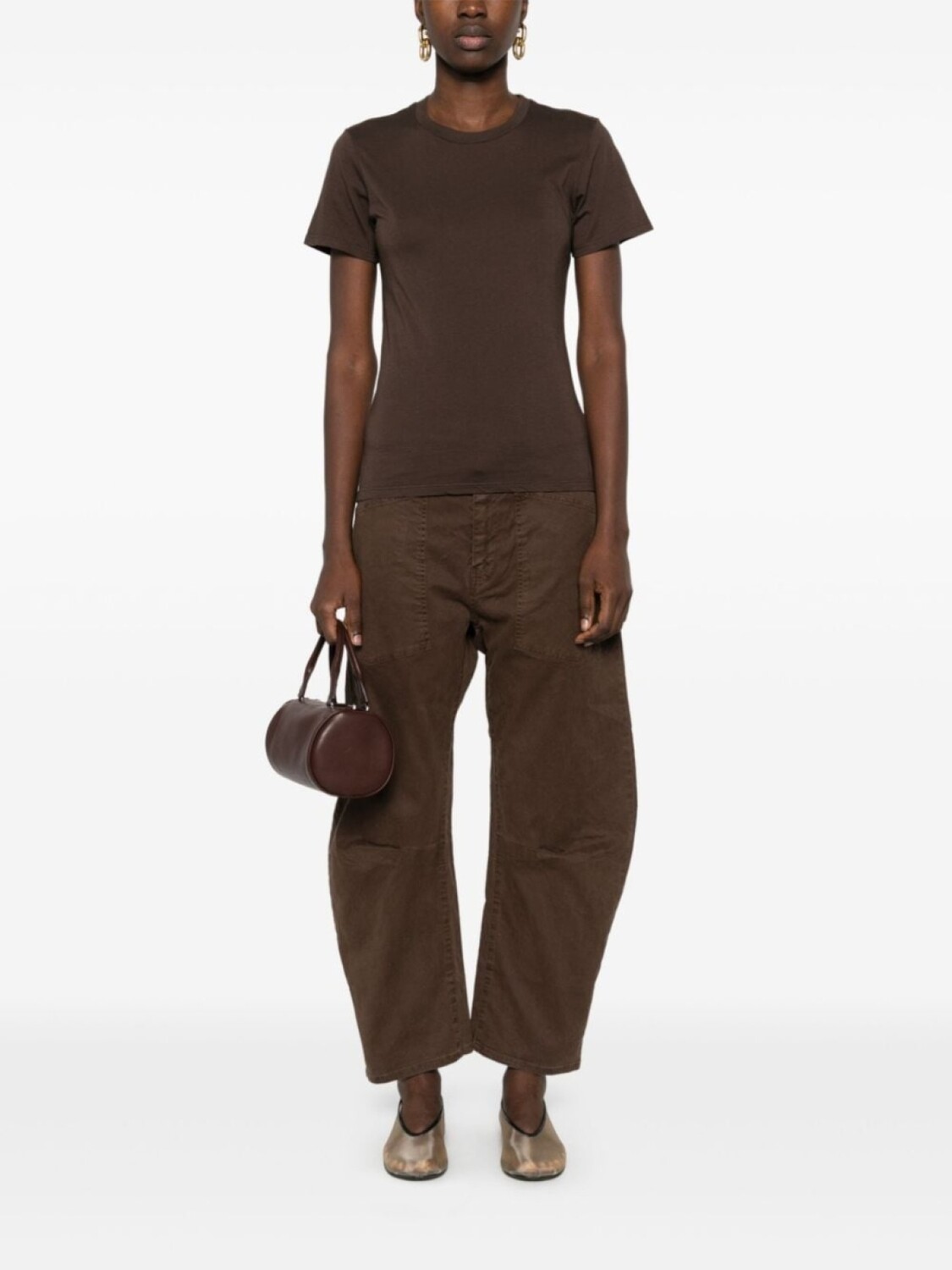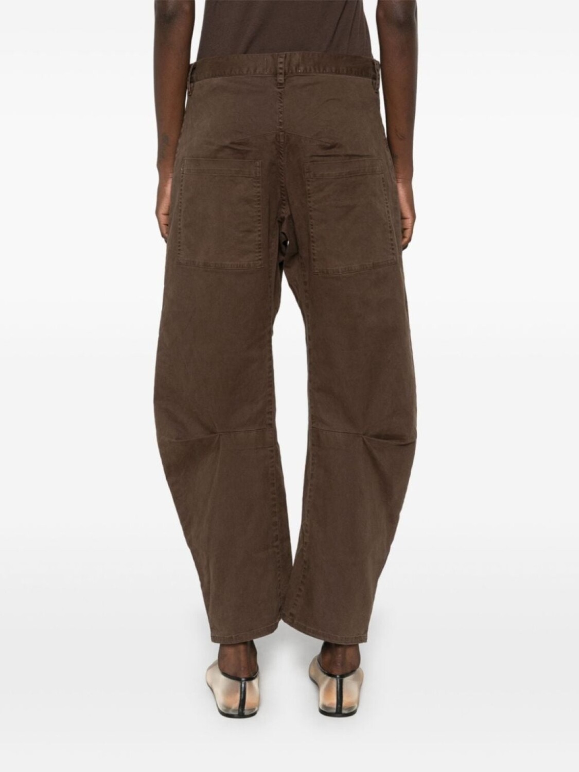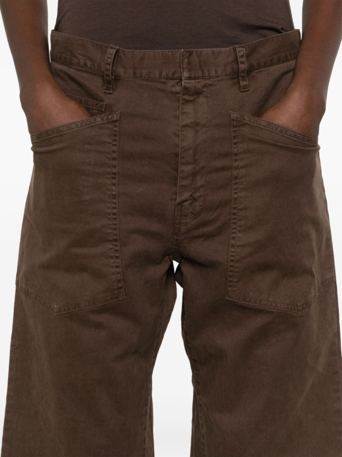 Темно-коричневый, смесовый хлопок, ткань с твиловым переплетением, потайная застежка спереди, петли для ремня, средняя посадка, три накладных кармана спереди, защипы, два накладных кармана сзади, зауженный крой