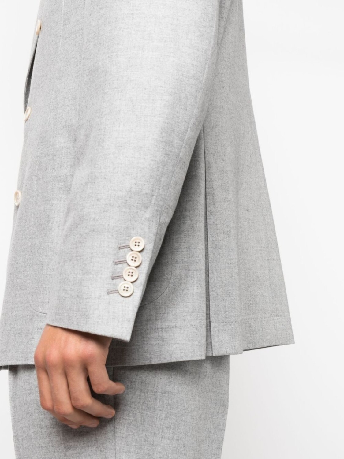 Смесь кашемира и шелка, заостренные лацканы, V-образный вырез, прорезной карман на груди, двубортная застежка на кнопки, длинные рукава, манжеты на пуговицах, два накладных кармана спереди и закругленный подол.