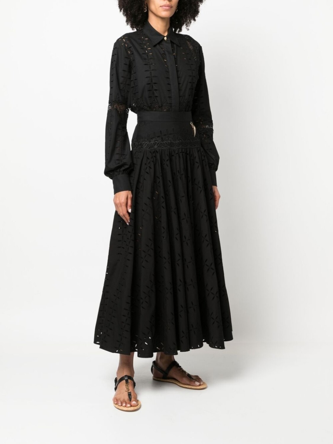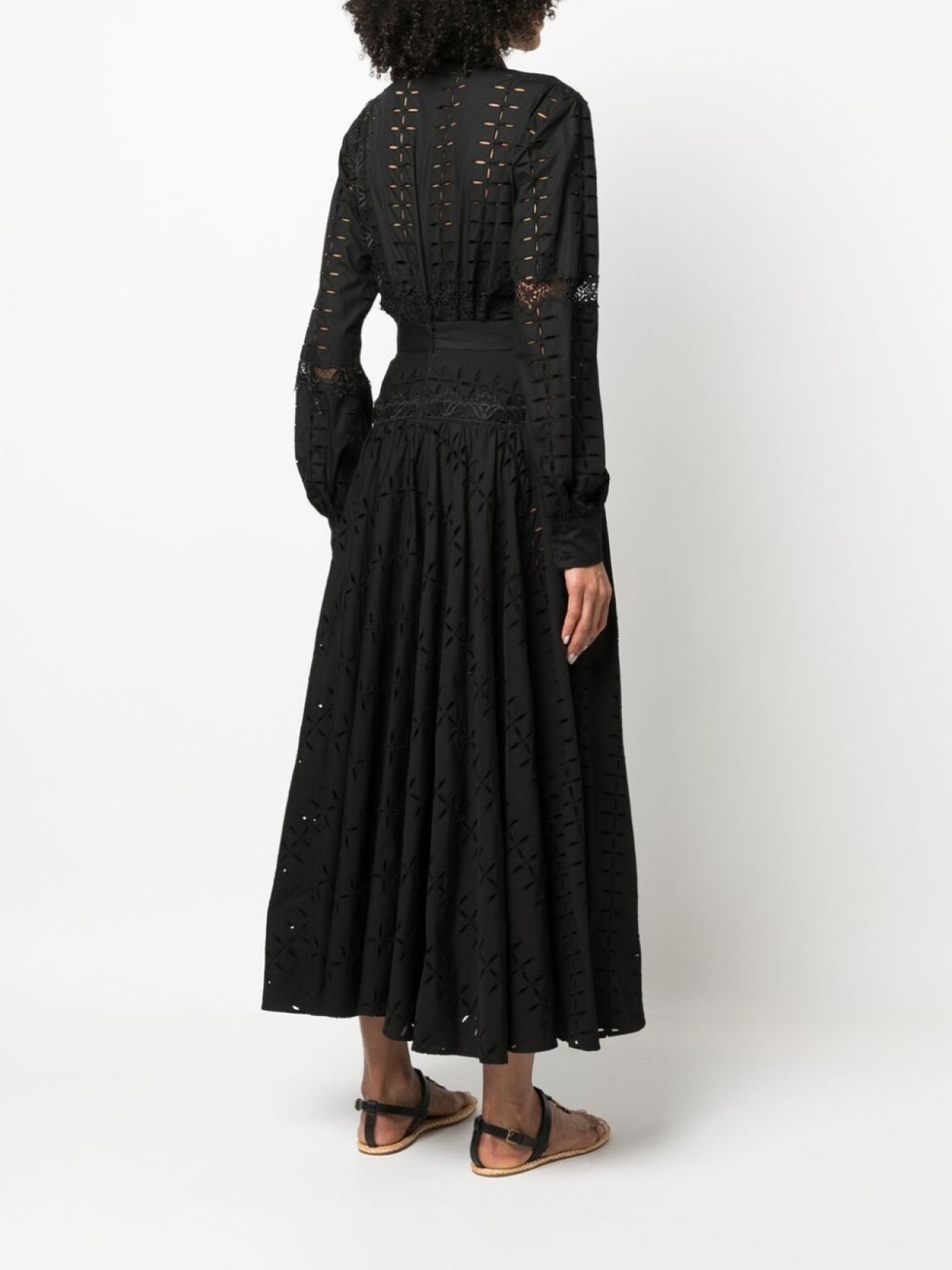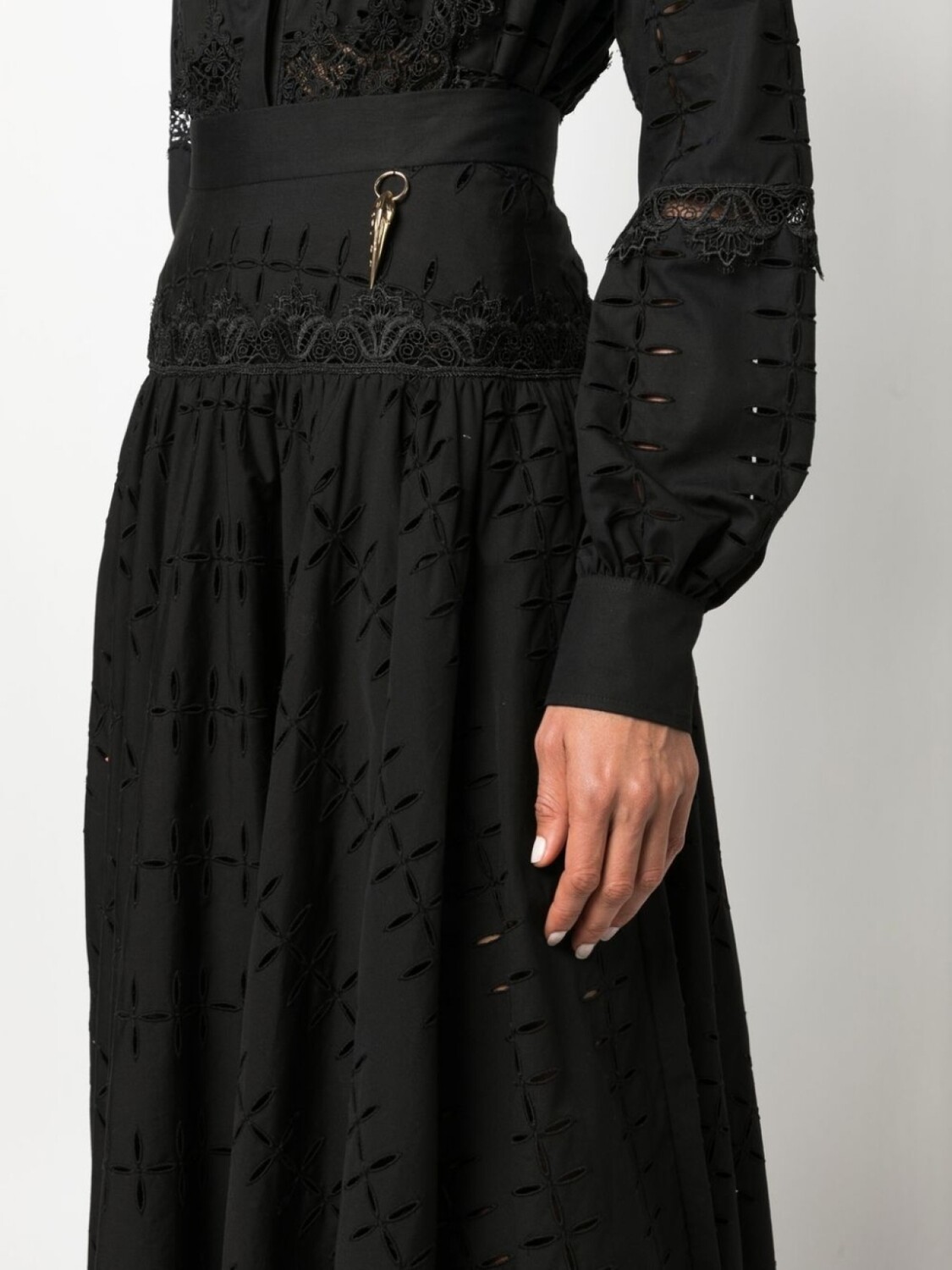 Черный, хлопок, знаковый декор Tiger Tooth, вставки из кружева, английская вышивка, завышенная талия, застежка на молнии сзади, А-образный силуэт и длина миди.