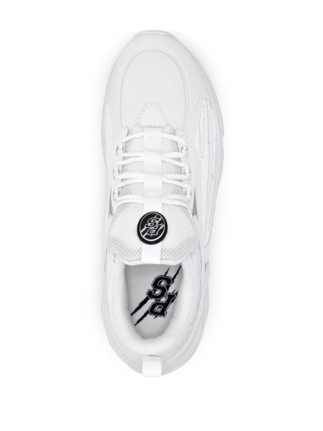 Белый, дизайн со вставками, сетчатые вставки, логотип сбоку, нашивка с логотипом на язычке, петля для подтягивания на язычке и сзади, закругленный носок, шнуровка спереди, массивная резиновая подошва