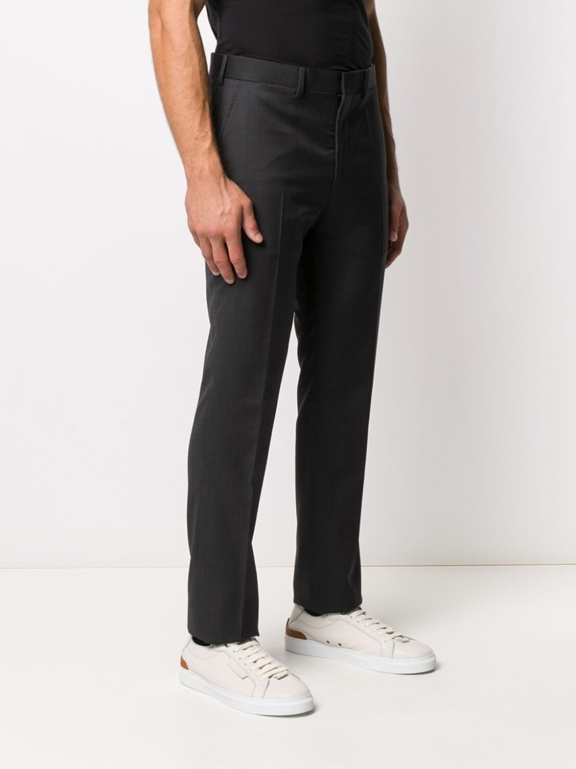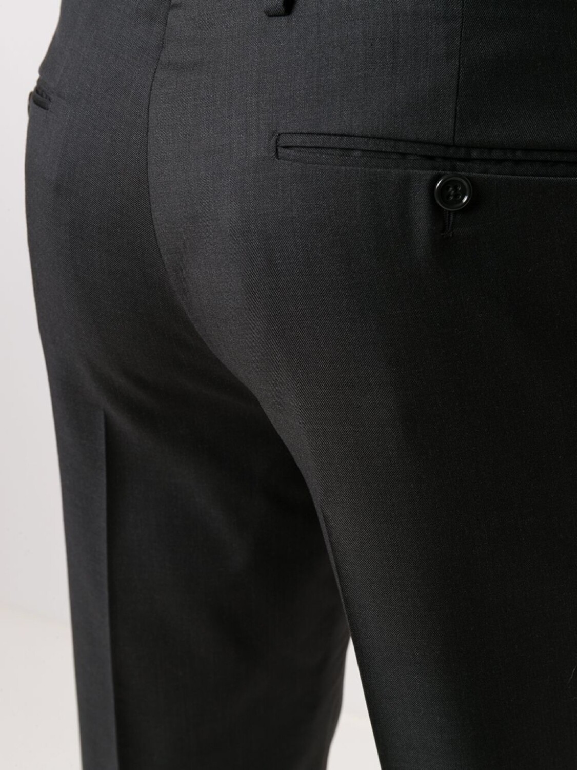 Прямой крой, потайная застежка спереди, петли для ремня, два прорезных кармана по бокам и задние карманы с листочкой.