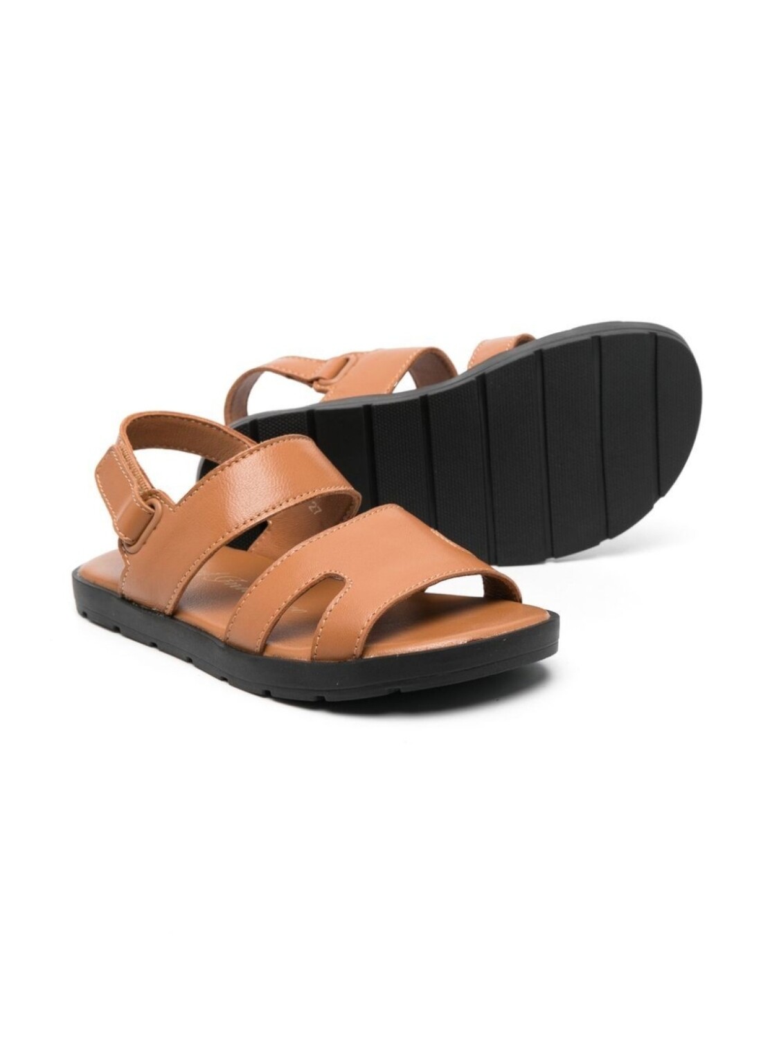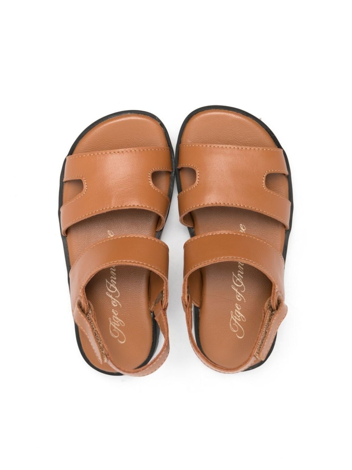 Бежево-коричневый, кожа, открытый носок, закругленный носок, застежка на липучке и плоская подошва.