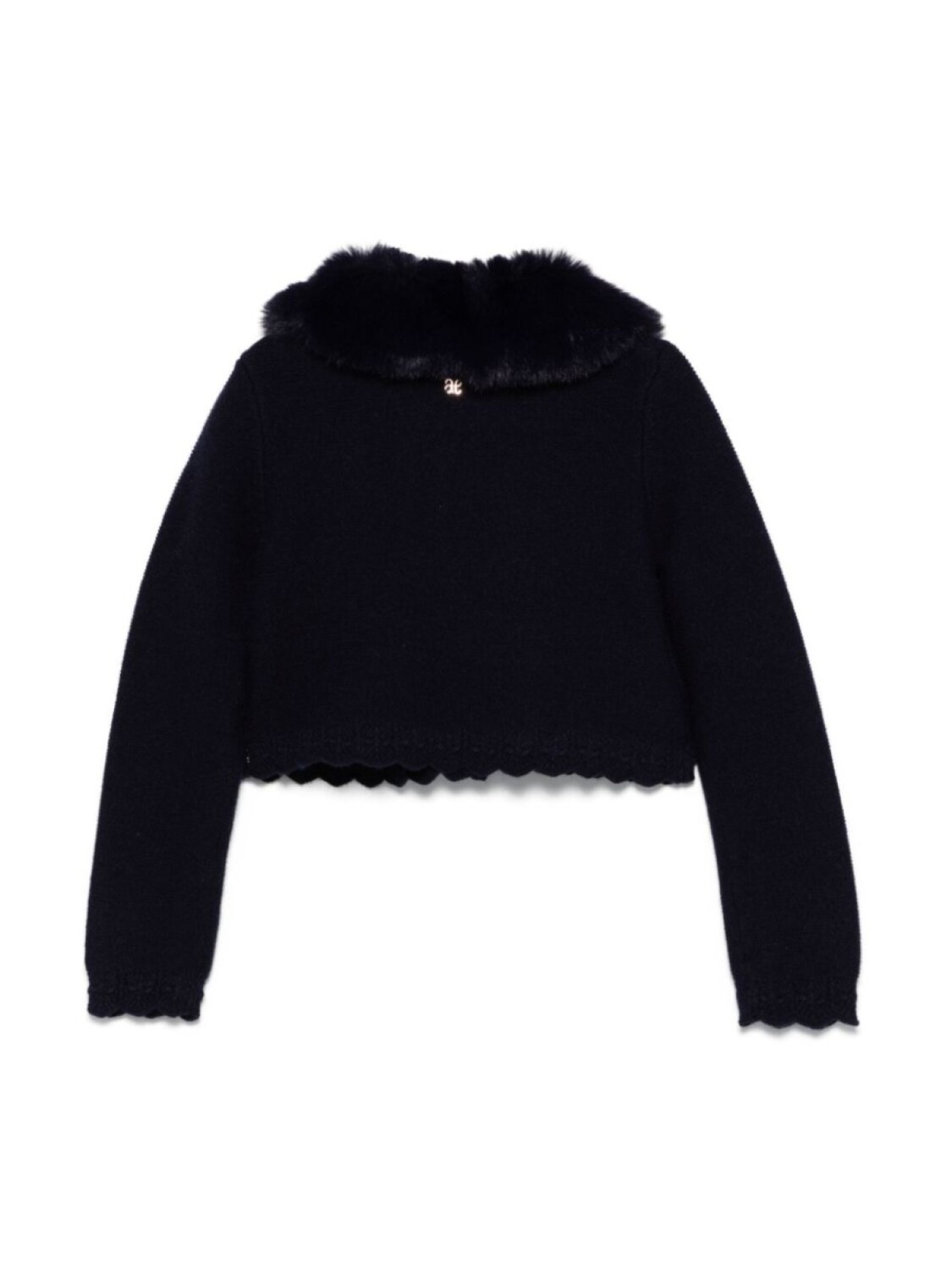 Темно-синий, вязаный дизайн, съемный воротник из искусственного меха, застежка на пуговице спереди, длинные рукава с фестонами, подол с фкстонами