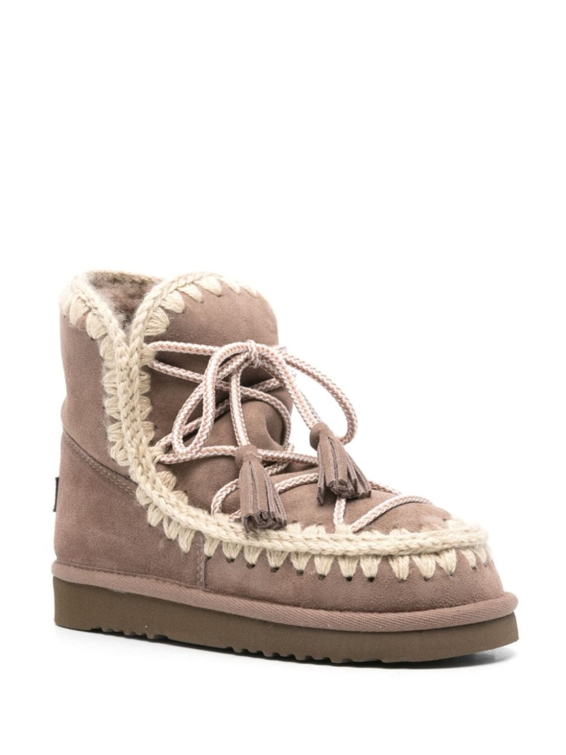 Серый, замша из телячьей кожи, обметочный шов, без застежки, нашивка с логотипом сзади, декоративные кисточки, закругленный носок, подкладка из овечьей шерсти, подошва из этиленвинилацетата (EVA), резиновая подошва, высота по щиколотку
