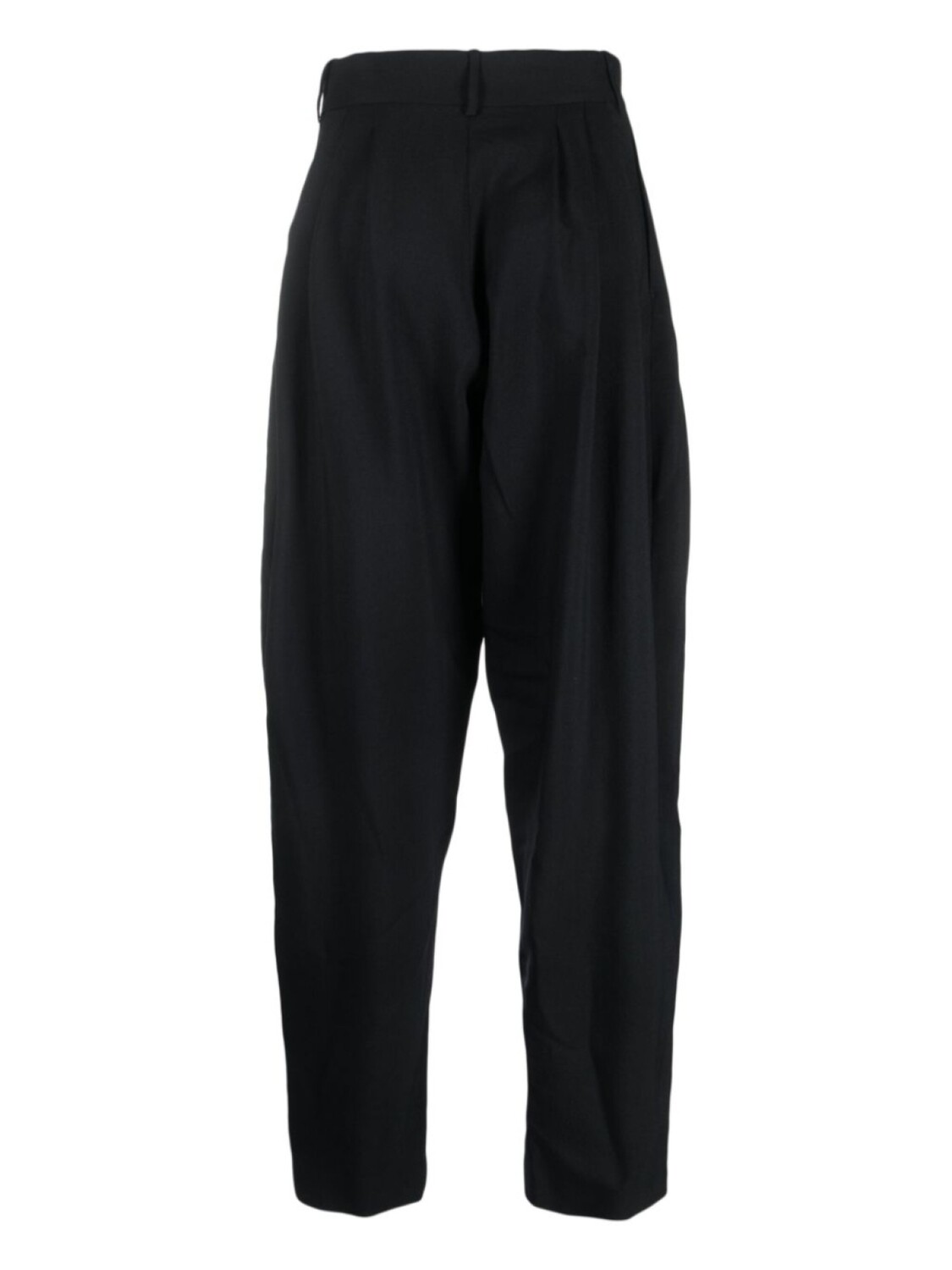 Черный, необработанная шерсть, завышенная талия, складки, петли для ремня, потайная застежка спереди, два прорезных кармана по бокам и зауженный крой.