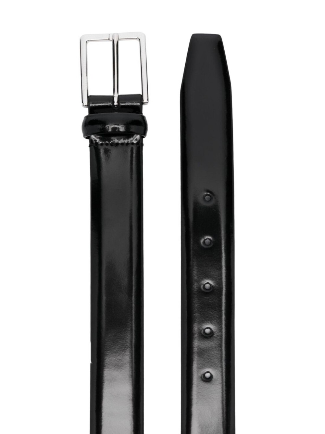 Черный, телячья кожа, лакированная отделка, застежка на серебристой пряжке, прорезанные отверстия и регулируемый дизайн.
