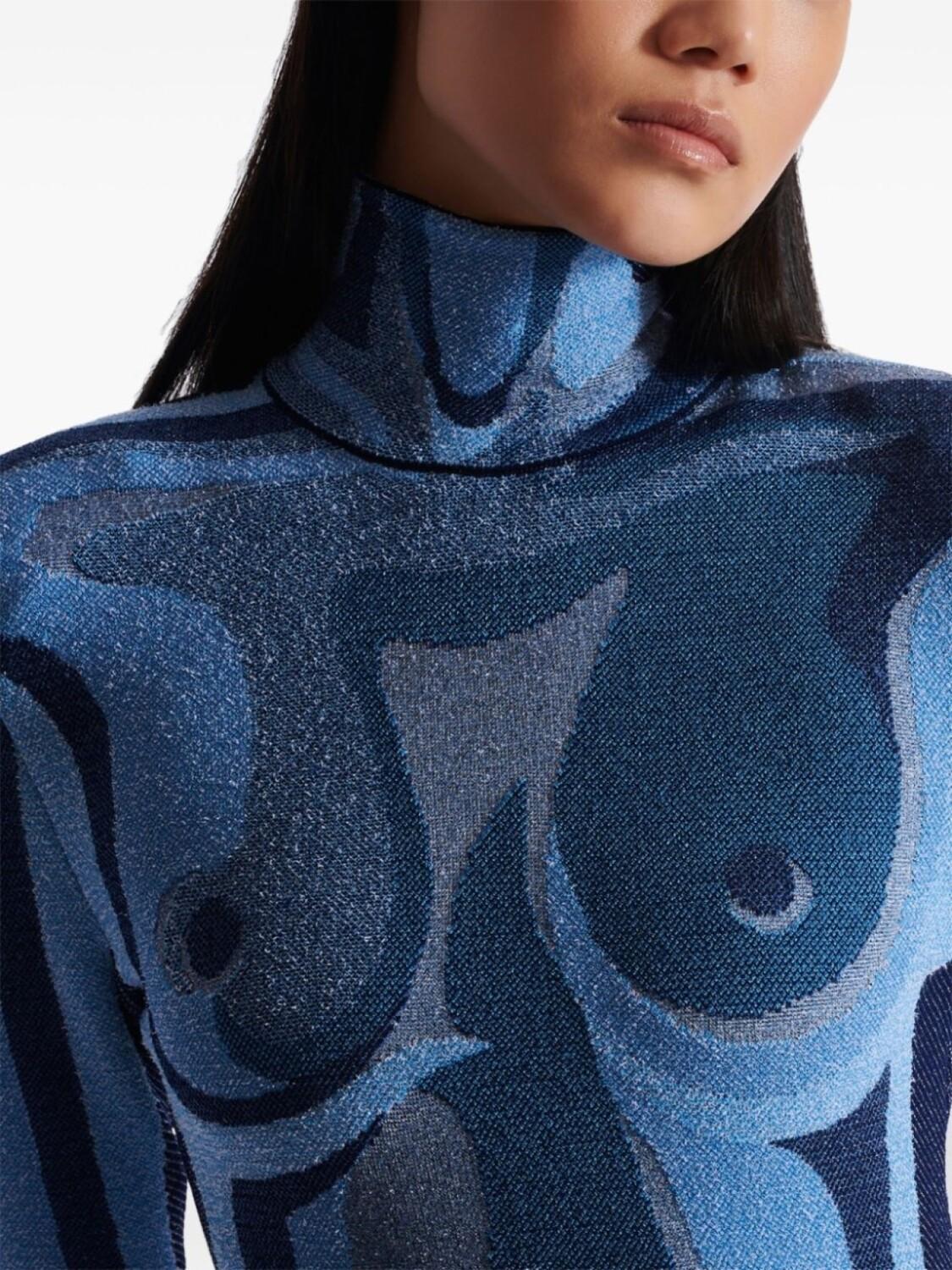 Синий, вязаный дизайн, сплошной графичный принт, высокий воротник, застежка на молнии сзади, длинные рукава, прямой подол, длина до бедер