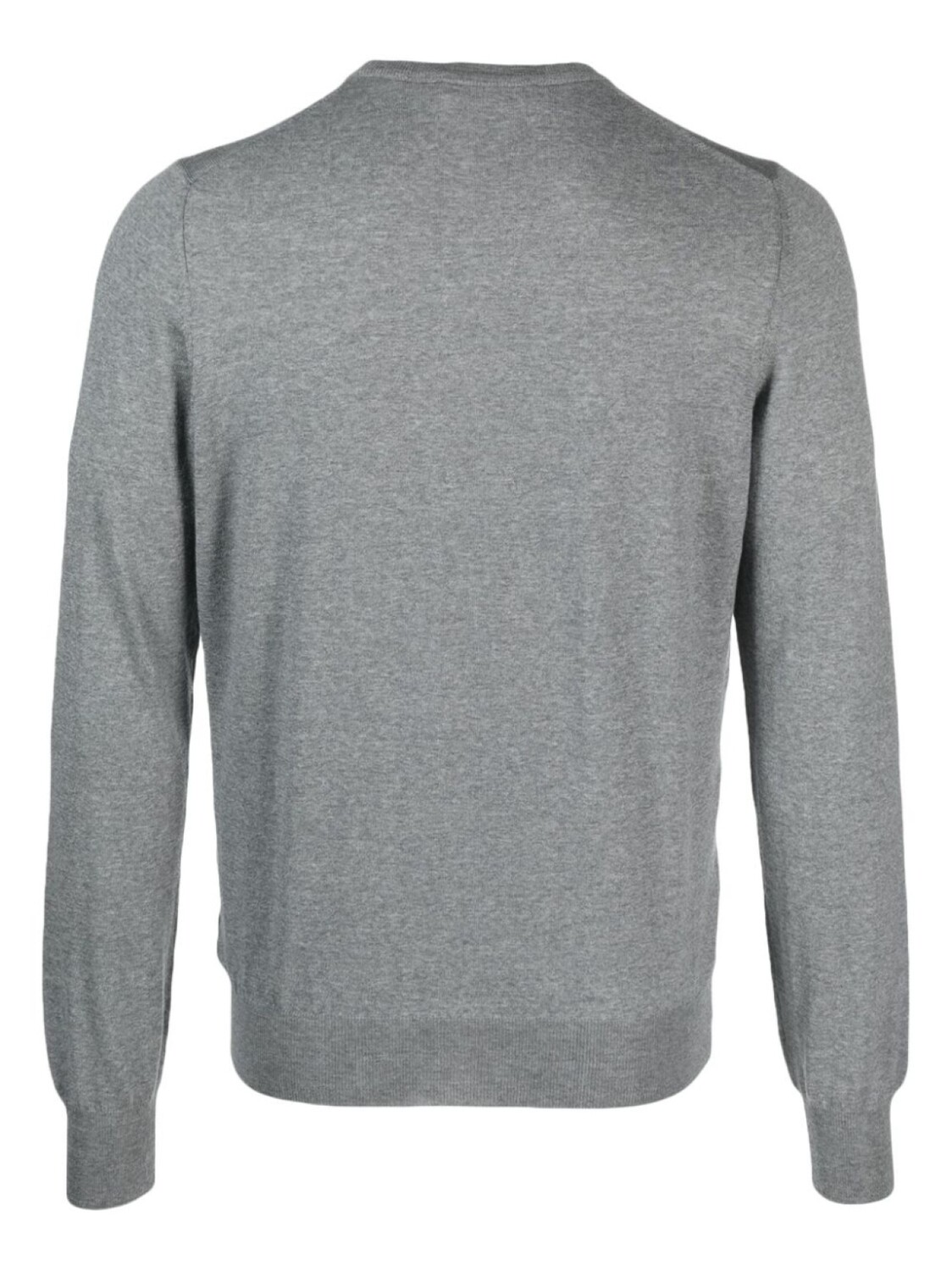 Серый бетон, необработанная шерсть, эффект меланж, круглый вырез, длинные рукава и прямой подол.