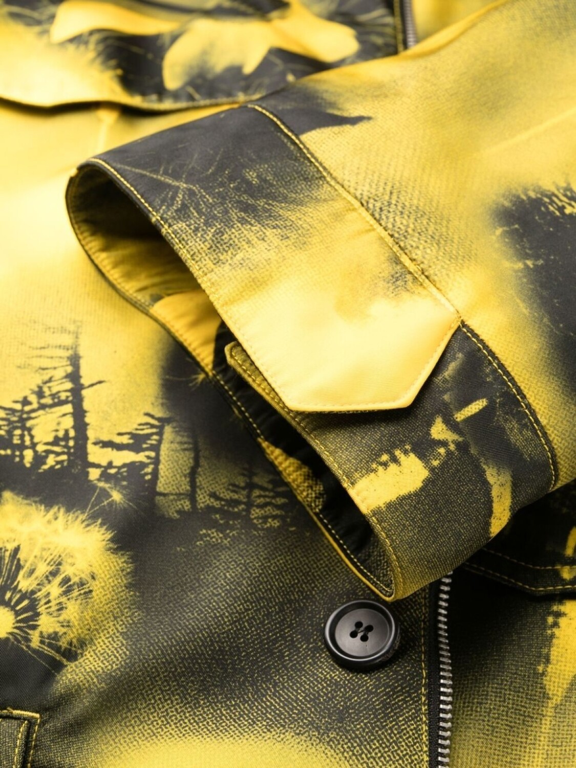 Желтый, черный, переработанный нейлон, треугольный эмалированный логотип, абстрактный принт, отложной воротник, штормовая заслонка, потайная застежка спереди, съемная косметичка, ремень на талии, передние карманы с клапаном и длинные рукава.