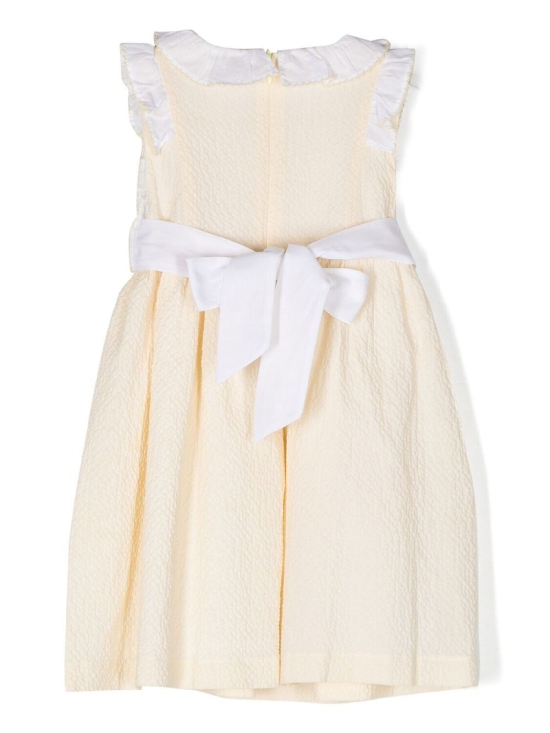 Светло-желтый, белый, смесовый хлопок, гофрированный эффект, расклешенная юбка, воротник с оборками, расклешенные рукава, завязка на бант сзади и длина миди.