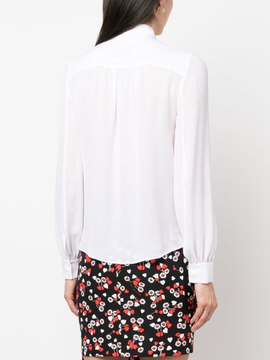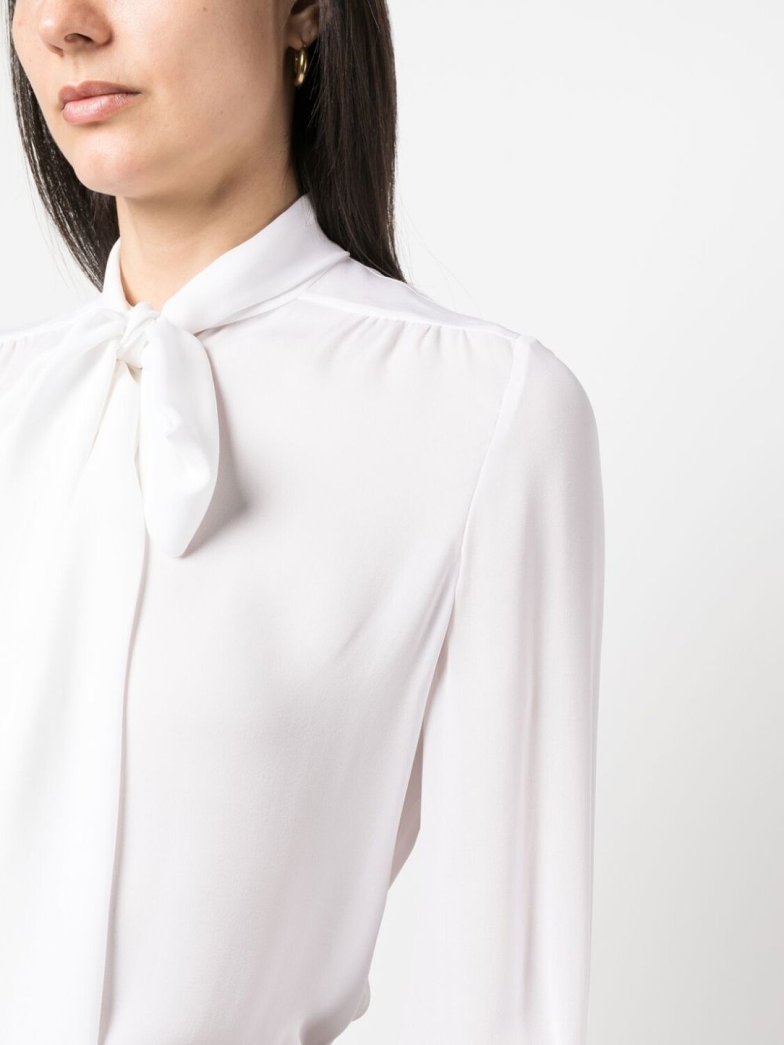 Расцветка Cloud White, шелк, воротник с бантом, застежка на пуговицах спереди, длинные рукава и рукава с манжетами на пуговицах.
