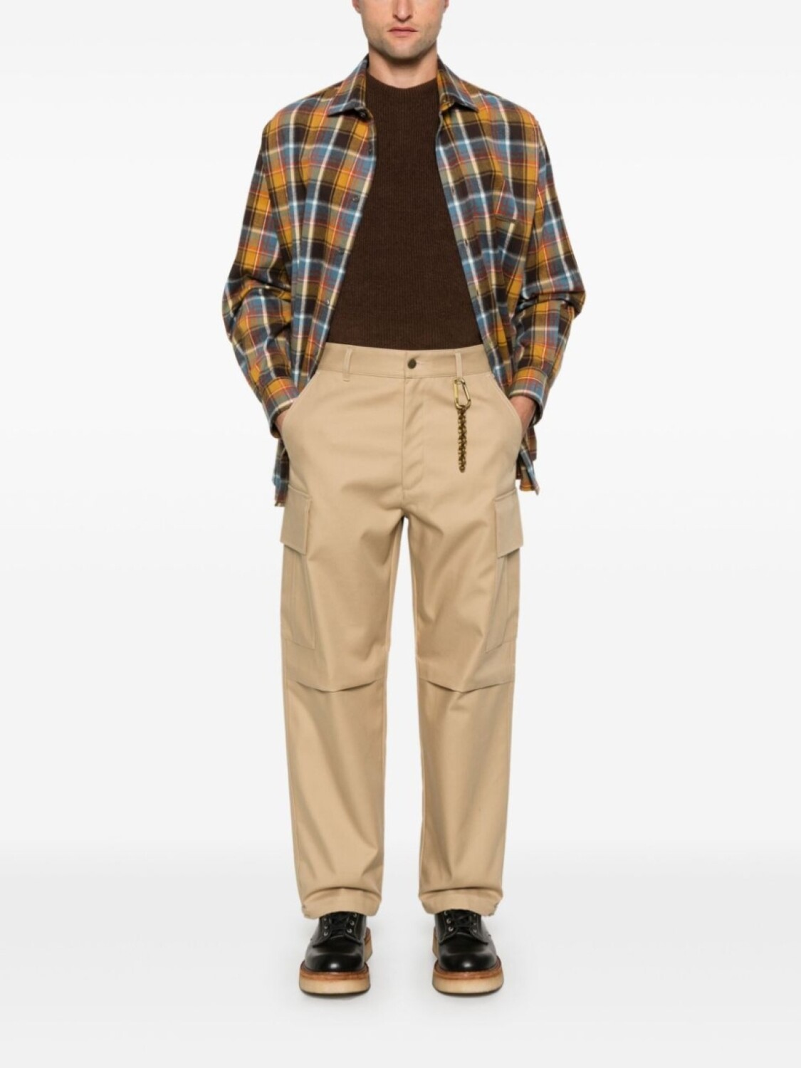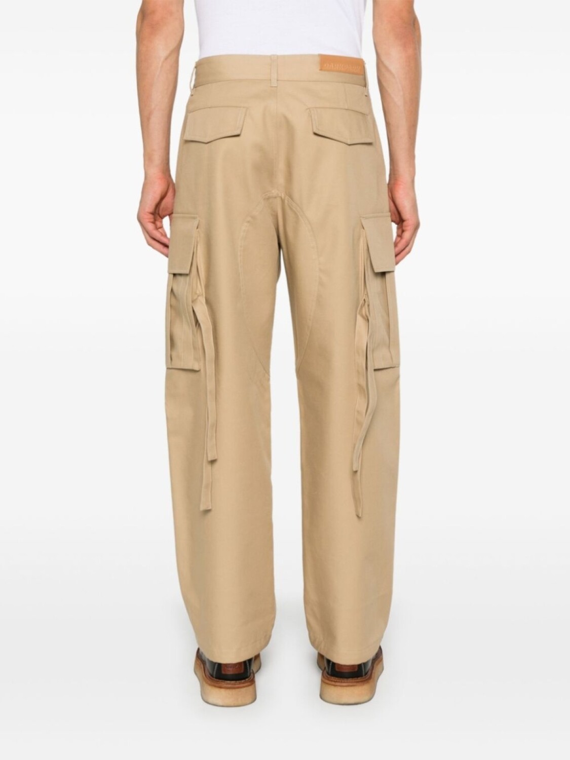 Подробнее о товаре: • бежевый • хлопок • ткань с твиловым переплетением • потайная застежка на молнии и пуговицах • средняя посадка • петли для ремня • крепление для ключей • два прорезных кармана по бокам • два накладных кармана по бокам • складки • защипы • нашивка с логотипом сзади • два боковых кармана с застежкой на кнопки • ремешки • подол с кулиской • прямой крой