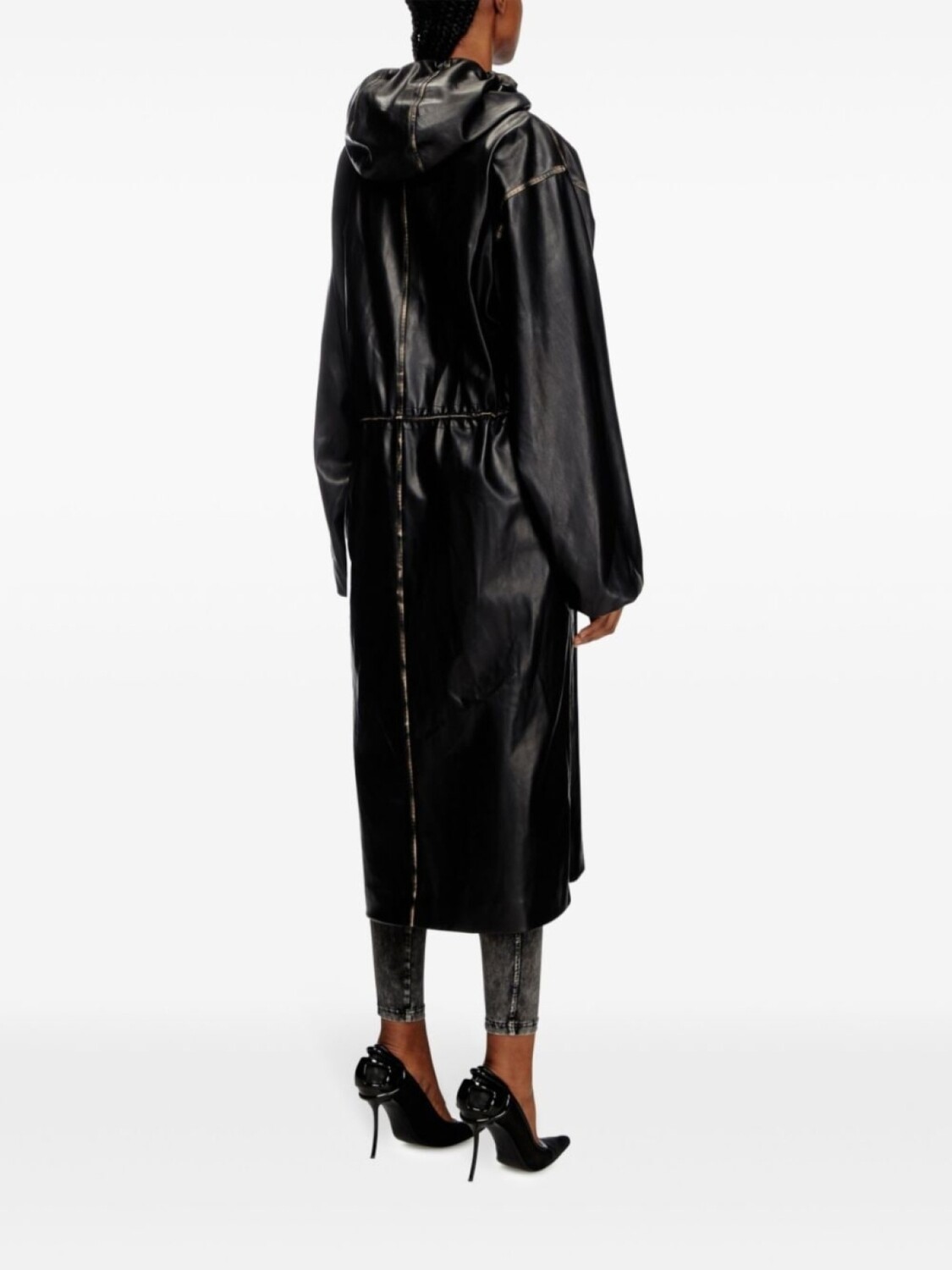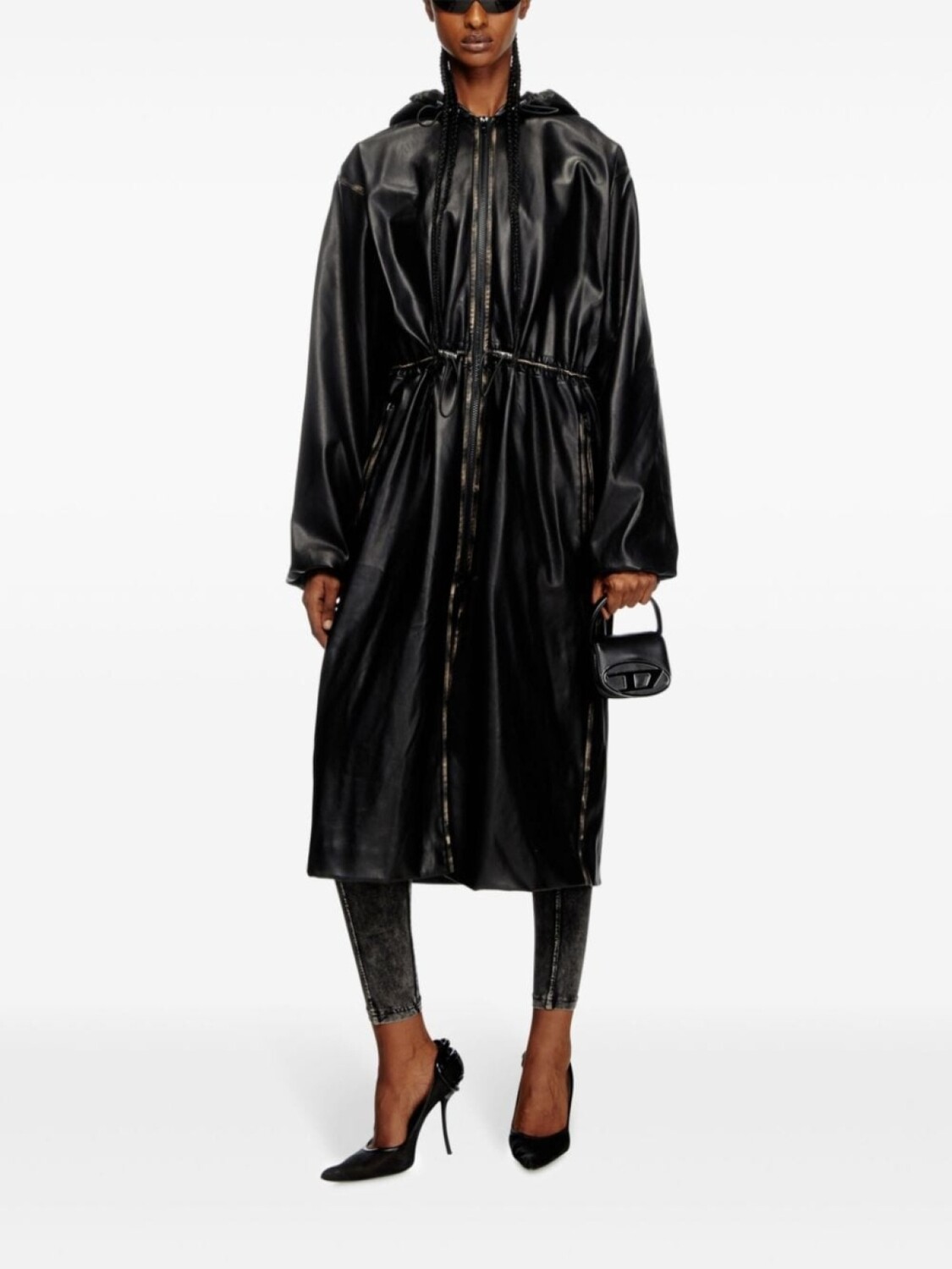 Черная искусственная кожа застежка-молния спереди капюшон на шнурке талия на шнурке длинные рукава манжеты на шнурке два боковых кармана на молнии прямой подол