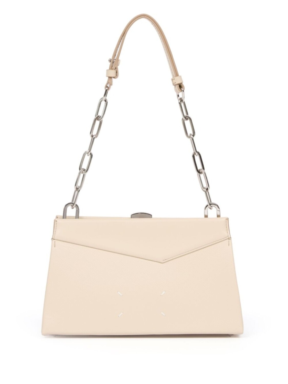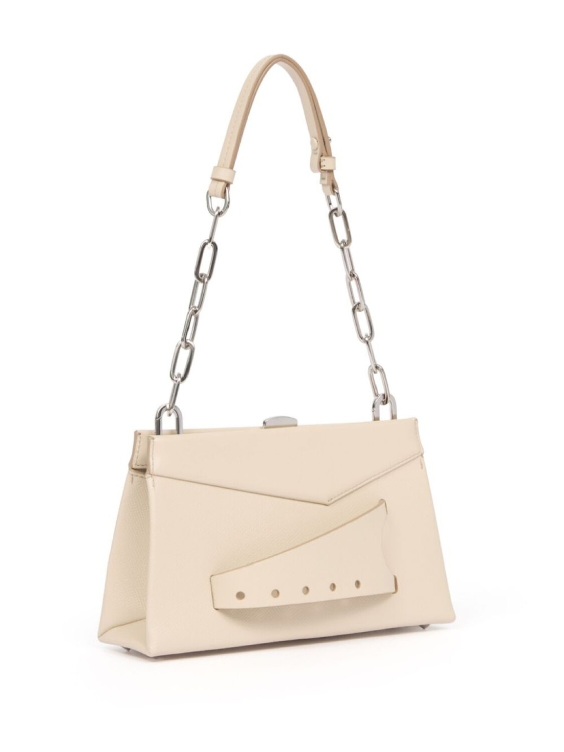 Бежевый, телячья кожа, гладкая текстура кожи, магнитная застежка, ремень на плечо с цепочной деталью, перфорация, нашивка с логотипом, основное отделение, внутренний накладной карман, В комплект входит мешок-пыльник для хранения.